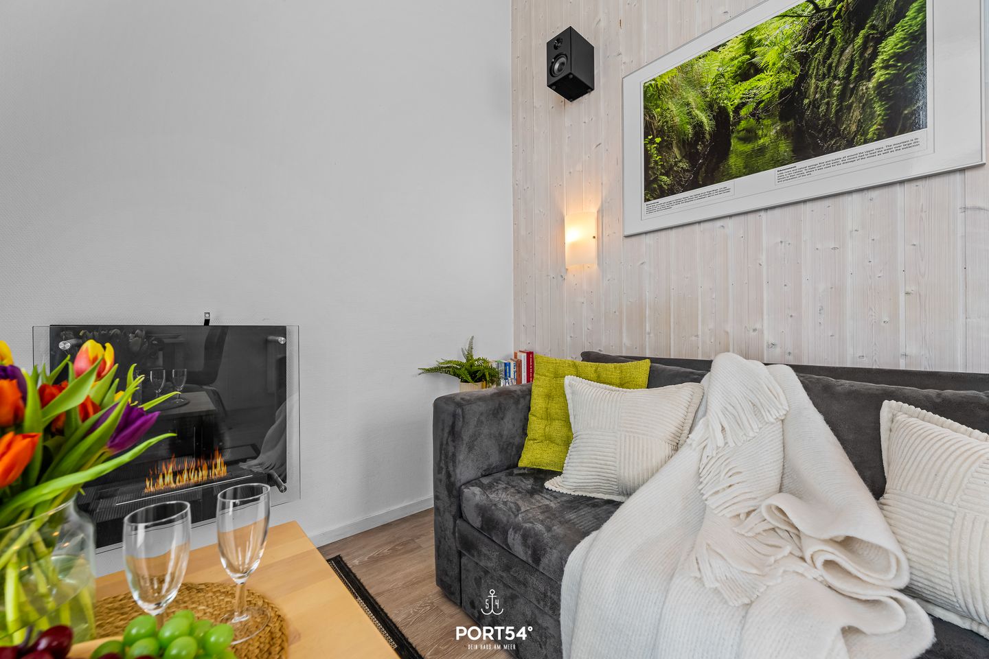 Der offene Wohnbereich bildet das Herzstück des Hauses. Mit seiner gemütlichen Couch, rustikalen Holzelementen und einem Bio-Ethanol-Kaminofen lädt er dich zu entspannten Abenden in wohliger Atmosphäre ein. Große Fenster holen die umliegende Natur ins Innere und lassen den Raum lichtdurchflutet erscheinen. Hier kannst du auf der Couch entspannen, ein Buch lesen oder bei einer Tasse Tee den Ausblick genießen. Ein Flachbild-TV und eine Musikanlage sorgen für zusätzliche Unterhaltung.