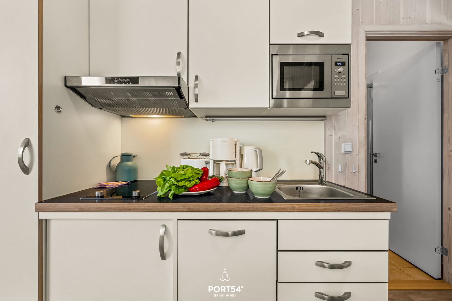 Die angrenzende, kompakte Küche ist bestens ausgestattet und bietet alles, was du brauchst, um gemeinsam zu kochen und kulinarische Genüsse zu zaubern. Der kleine, gemütliche Essbereich lädt zu genussvollen Mahlzeiten und langen Gesprächen ein – ein perfekter Ort, um den Tag Revue passieren zu lassen. Die Küche ist ausgestattet mit 2-Platten-Cerankochfeld, Kühlschrank mit Gefrierfach, Mikrowelle und Kaffeemaschine.