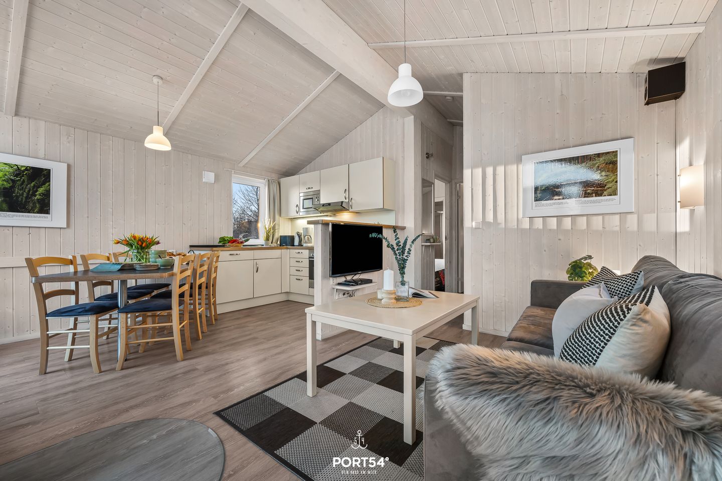 Der offene Wohnbereich ist das Herz des Hauses. Eine gemütliche Couch, rustikale Holzelemente und ein Holzofenkamin sorgen für eine behagliche Atmosphäre, die zum Entspannen einlädt. Große Fenster lassen viel Tageslicht herein und bieten einen malerischen Blick auf die umliegende Natur. Zur Unterhaltung stehen ein Flachbild-TV und eine Musikanlage bereit.