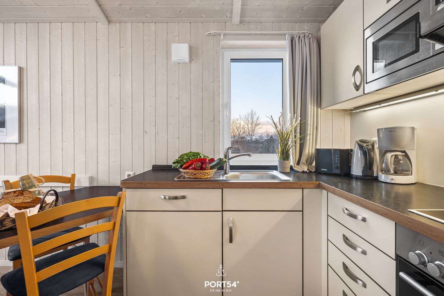 Die voll ausgestattete Wohnküche bietet alles, was du für gemeinsame Kochabende benötigst: Cerankochfeld, Backofen, Kühlschrank mit Gefrierfach, Mikrowelle und Kaffeemaschine. Der Essbereich lädt zu gemeinsamen Mahlzeiten und geselligen Gesprächen ein.