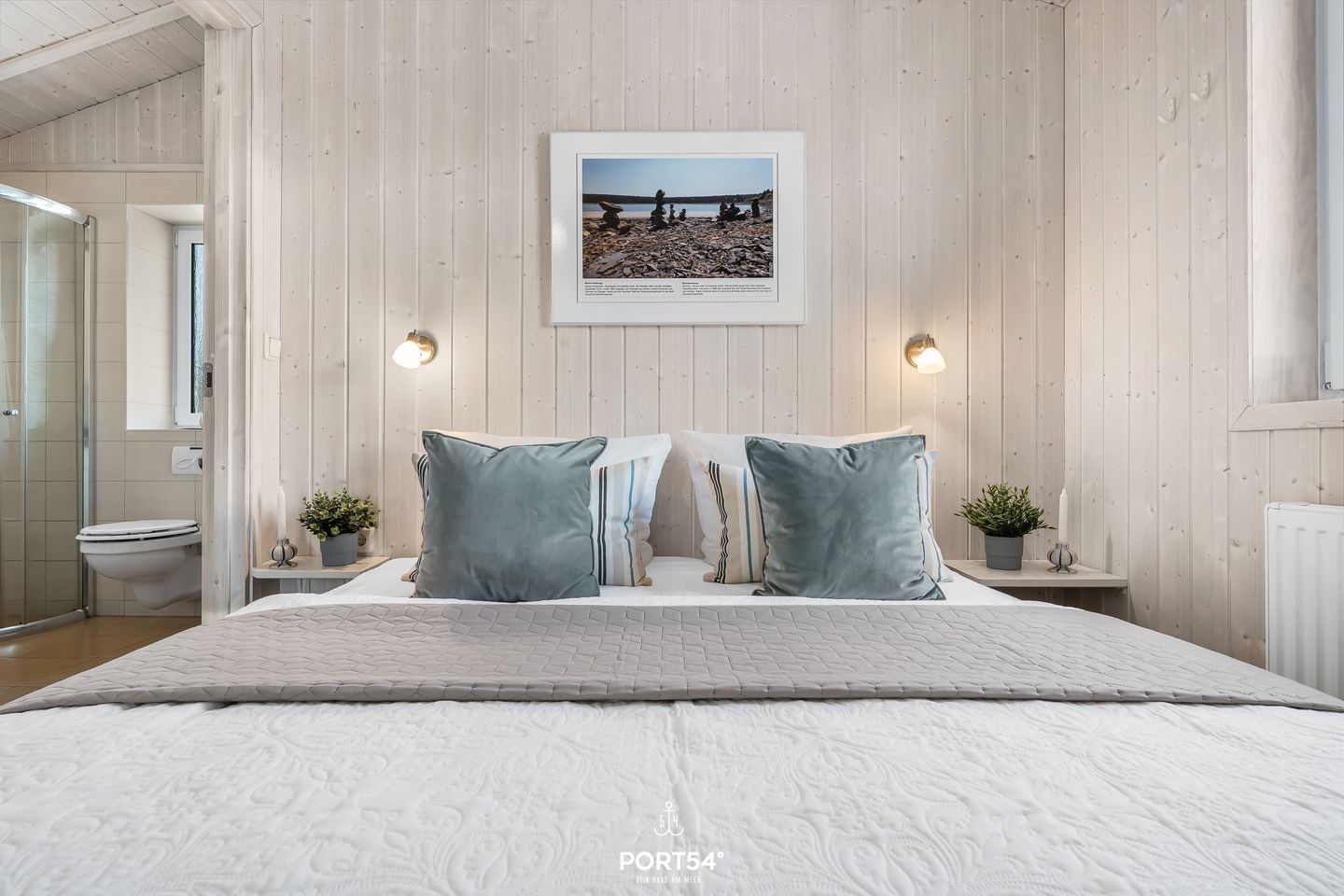Das Ferienhaus verfügt über zwei Schlafzimmer, die jeweils mit zwei zusammengeschobenen Einzelbetten (zusammen 160 x 200 cm) ausgestattet sind. Die ruhige und naturnahe Farbgestaltung schafft eine angenehme, entspannte Atmosphäre für erholsame Nächte. Im Wohnzimmer findest du eine ausziehbare Schlafcouch (140 x 190 cm), die Platz für zwei weitere Personen bietet – ideal für Kinder oder Freunde. Bettwäsche und Handtücher können optional hinzugebucht werden.