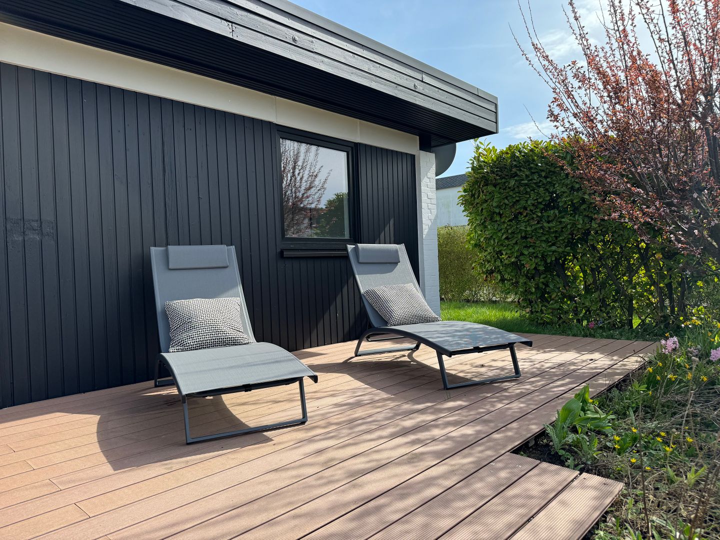 Im Außenbereich genießen Sie die Vorzüge eines privaten Gartens mit Gartenmöbeln, Sonnenliegen, einer Außensauna (Fasssauna )und einer Feuerstelle. Ein Gasgrill lädt zu geselligen Mahlzeiten im Freien ein. Für Ihr Fahrzeug steht ein kostenloser Privatparkplatz zur Verfügung, zudem gibt es einen eigenen Ladeanschluss für Elektroautos.