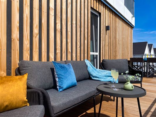 Herzlich willkommen in der "Baltic Pearl" – Ihrer Oase mit traumhaftem Hafenblick in Olpenitz! Tauchen Sie ein in eine Ferienwohnung der Extraklasse, die in der 2. Etage mit Aufzug, auf großzügigen ca. 97m² alles bietet, um Ihren Ostseeurlaub einzigartig zu gestalten. Der lichtdurchflutete Wohn-/Essbereich lädt zum geselligen Beisammensein ein, während die vollausgestattete Küche alles bietet, um gemeinsame Kochabende zu einem kulinarischen Erlebnis zu machen. Im Wohnzimmer erwartet Sie ein gemütliches Sofa, auf dem Sie die Urlaubstage entspannt vor dem Kamin ausklingen lassen können. Die beiden Schlafzimmer sind perfekte Rückzugsorte für erholsame Nächte. Im ersten Schlafzimmer erwartet Sie ein komfortables Boxspring-Doppelbett (180x200cm) mit Flachbild-TV, während das zweite Schlafzimmer mit zwei Boxspringeinzelbetten (je 90x200cm) ausgestattet ist. Beide Schlafzimmer verfügen über Verdunkelungsmöglichkeiten für einen tiefen und erholsamen Schlaf und jeweils einem Kleiderschrank. Das Badezimmer präsentiert sich mit einer modernen, ebenerdigen Dusche, WC, einem Waschtrockner, Handtuchtrockner und einem Föhn. Doch das Highlight ist der von allen Zimmern aus zugängliche, möblierte Balkon, der die perfekte Kulisse bietet, um schöne Momente zu erleben und neue Energie zu tanken. Hier kann man die Seele baumeln lassen – sei es beim Sonnenbaden auf der Liege, beim Entspannen in der einladenden Loungeecke oder beim Genießen eines erfrischenden Drinks mit Blick auf den Hafen oder die Ostsee.