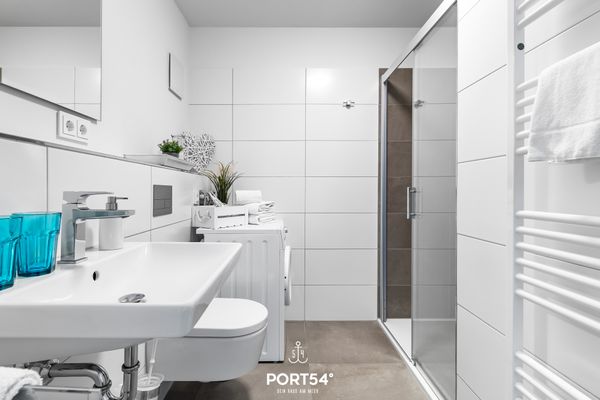 Das moderne Badezimmer verfügt über eine bodengleiche Dusche, Haartrockner und Kosmetikspiegel. Die Fußbodenheizung sorgt in allen Räumen für angenehme Temperaturen. Waschmaschine und Bügeleisen stehen für längere Aufenthalte bereit und Sichtschutz an allen Fenstern garantiert Privatsphäre.