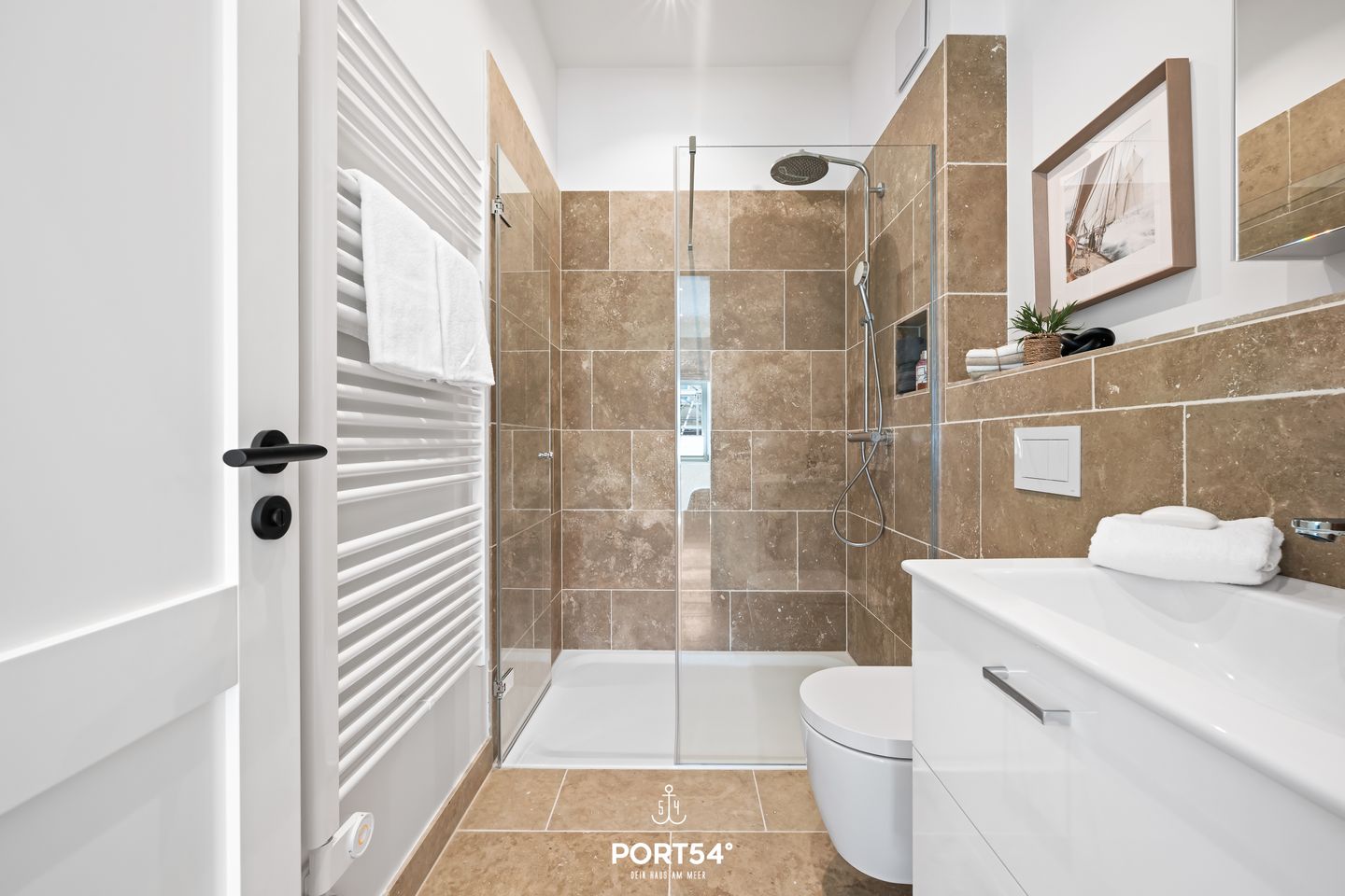 Im modernen Badezimmer finden Sie eine ebenerdige Dusche, WC, Föhn, Handtuchtrockner und Naturstein-Fliesen.