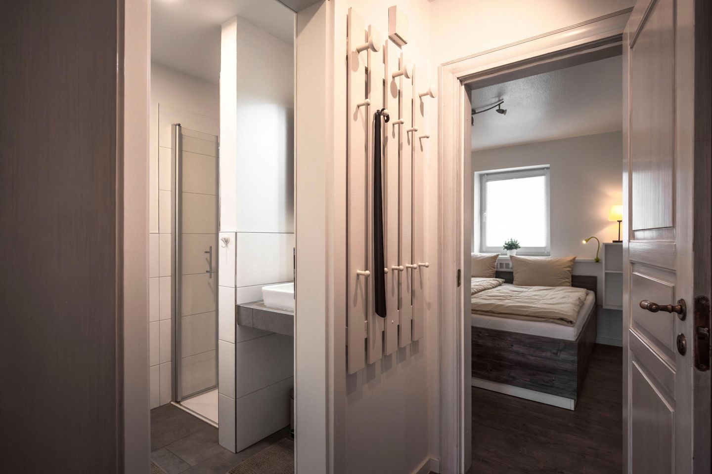 Im Badezimmer erwartet Sie eine bodengleiche Dusche, die für zusätzliche Barrierefreiheit sorgt. Ein Waschbecken, ein Spiegel, ein WC und eine Erstausstattung an notwendigen Hygieneartikeln sind vorhanden. Für Ihren Komfort stehen in der Unterkunft zudem eine Garderobe, ein Ganzkörperspiegel sowie ein gemeinschaftlich nutzbarer Waschmaschinenplatz bereit.