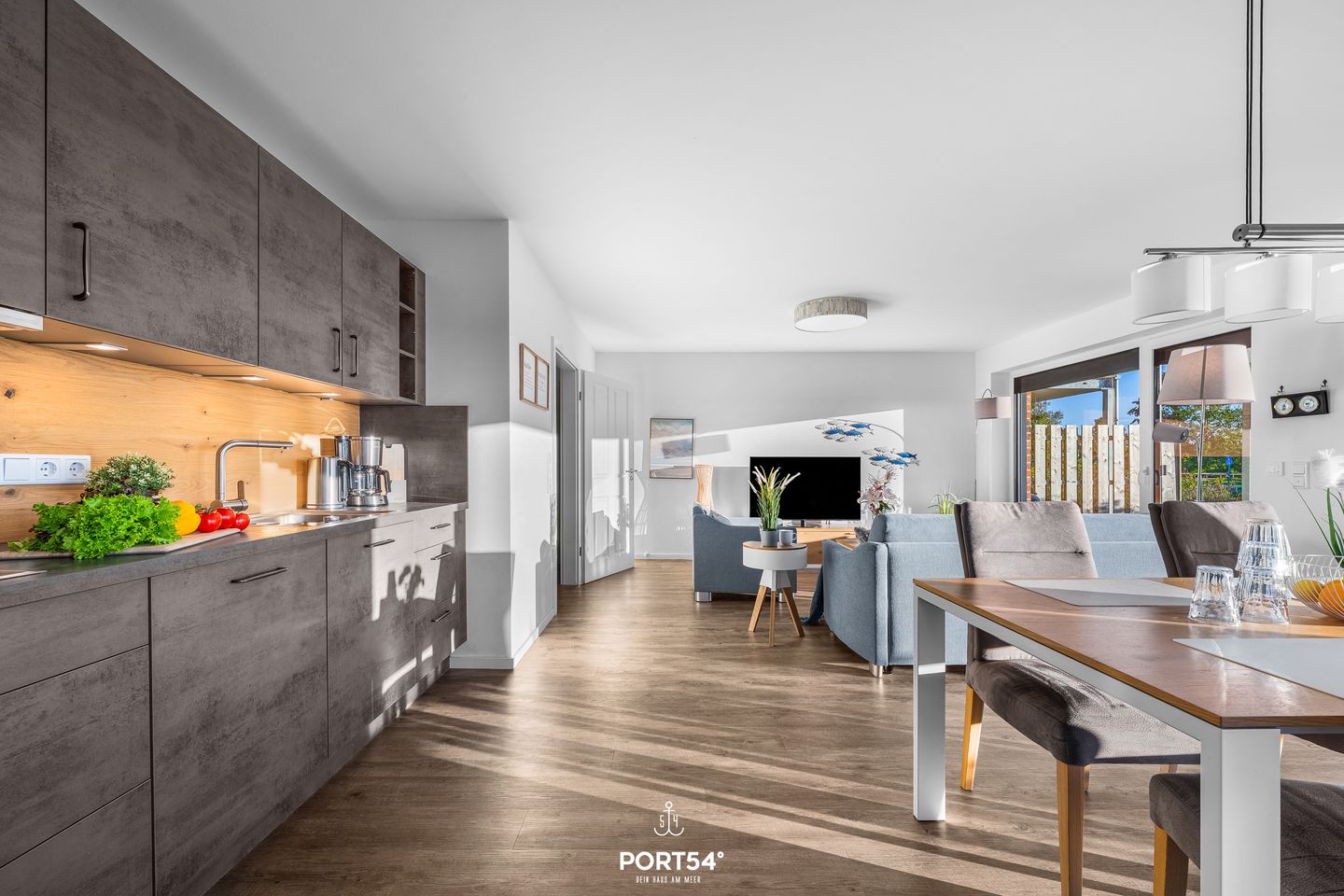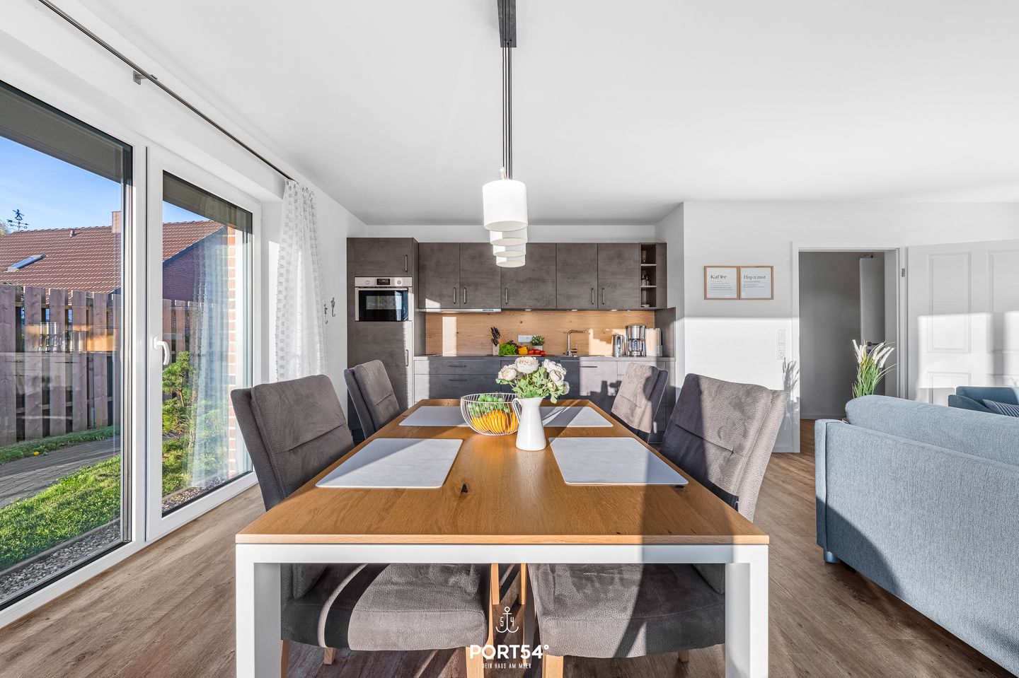 Die Ferienwohnung „Meerverliebt“ bietet auf knapp 70m² einen gemütlichen Rückzugsort für Ihren Urlaub am Deich. Im großzügigen Wohn- und Essbereich mit offener Küche, die keine Wünsche offenlässt, kommt die Familie gerne zusammen um zu spielen, zu entspannen oder zu kochen. Es gibt eine Auswahl an Gesellschaftsspielen und Büchern, um die Abende oder einen Regenschauer am großen Esstisch oder auf der Couch zu gestalten und zu genießen. Vom offen gestalteten Wohn- und Essbereich betritt man die teilüberdachte Terrasse. Die Sonne begleitet Sie dort während des Tages bis zum Abend hin. Ein Höchstmaß an Großzügigkeit und freien Blick über den Nordgrovenkoog, die Wiesen und Weiden in Richtung der drei Kilometer entfernten Nordsee - einfach MEERVERLIEBT! Das Schlafzimmer mit gemütlichem Doppelboxspringbett (180x200cm) bietet eine erholsame Nachtruhe. Zwei weitere Personen finden auf dem Schlafsofa (149x200cm) einen gemütlichen Schlafplatz.