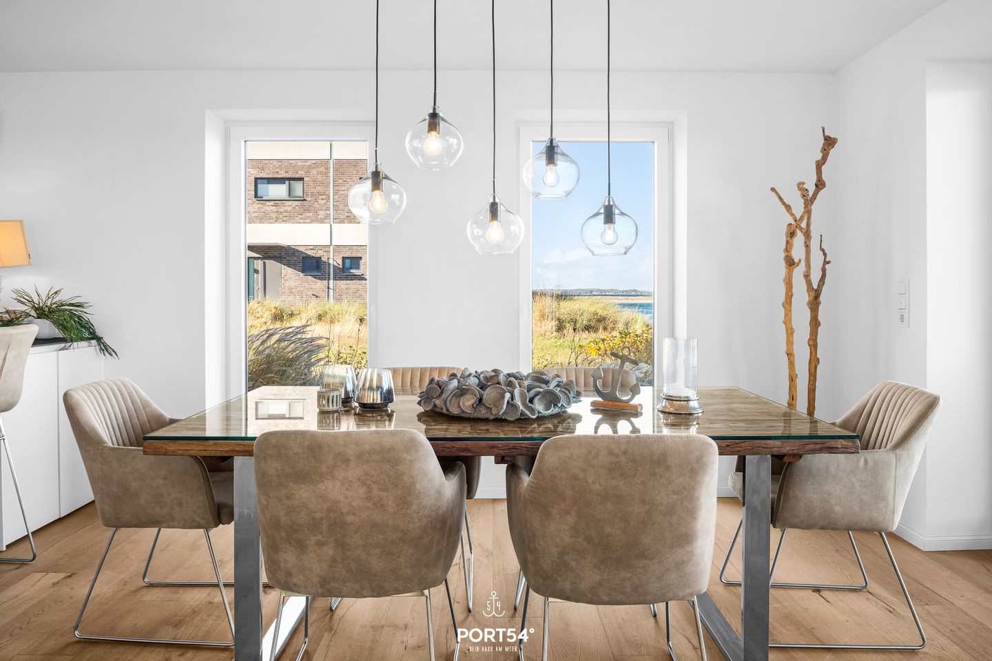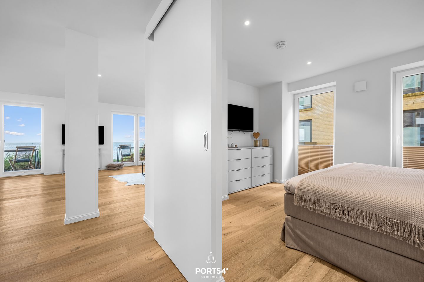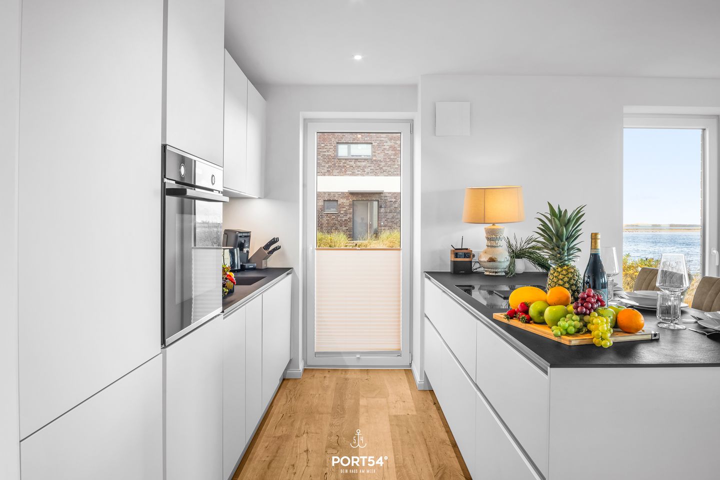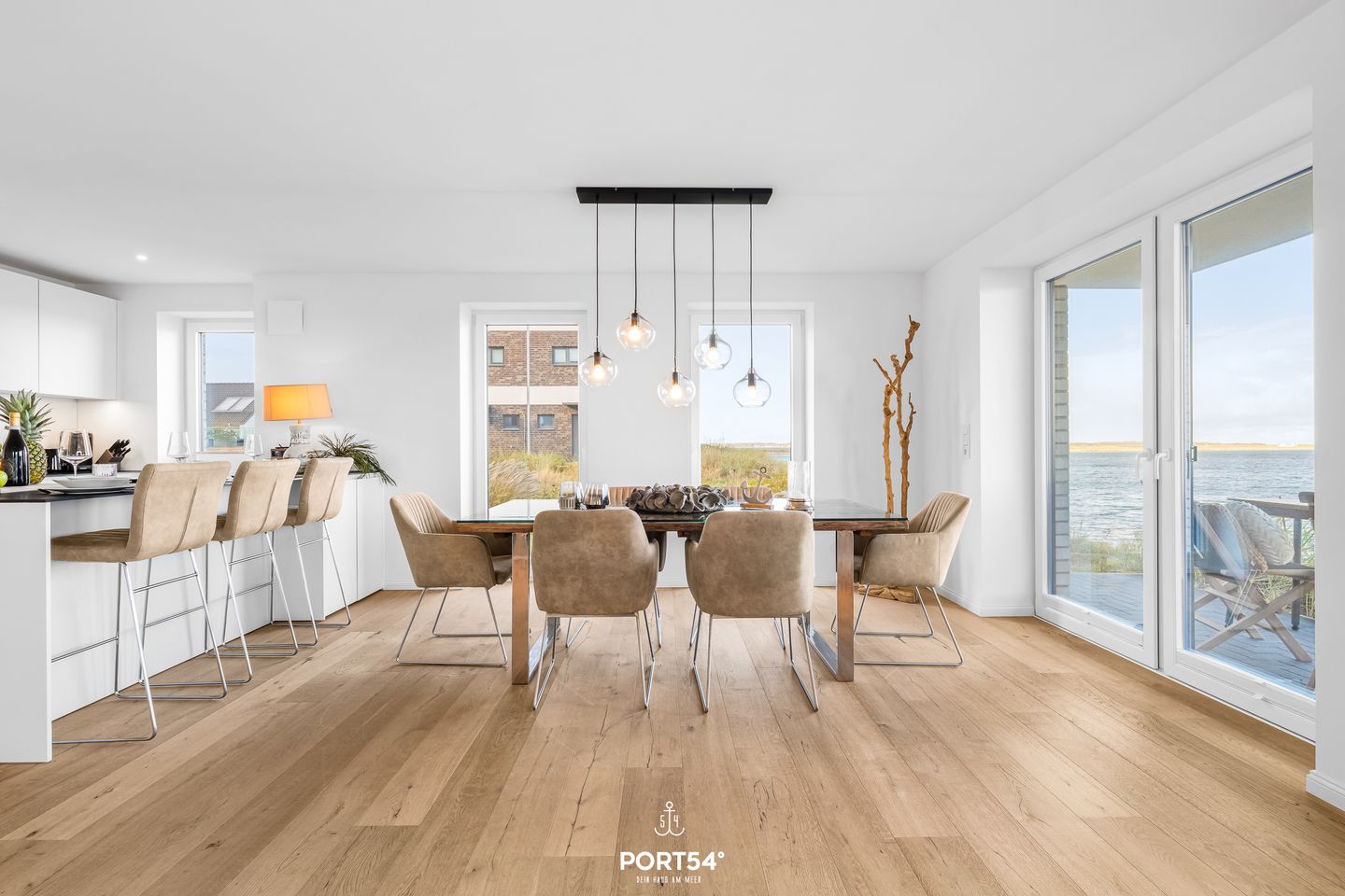 Der offene Wohn- und Essbereich lädt zum Verweilen und Genießen ein. Eine voll ausgestattete, grifflos gestaltete Küche macht das Kochen zu einem Erlebnis, während der gemütliche Küchentresen und der elegante Esstisch mit Meerblick den Raum für unvergessliche gemeinsame Mahlzeiten bieten. Ob beim Kochen oder relaxen – der atemberaubende Blick auf die Ostsee wird Ihr ständiger Begleiter sein. Das helle Wohnzimmer öffnet sich mit großen Fenstern direkt zur See, sodass Sie jederzeit den beruhigenden Anblick des Wassers und das sanfte Meeresrauschen genießen können.