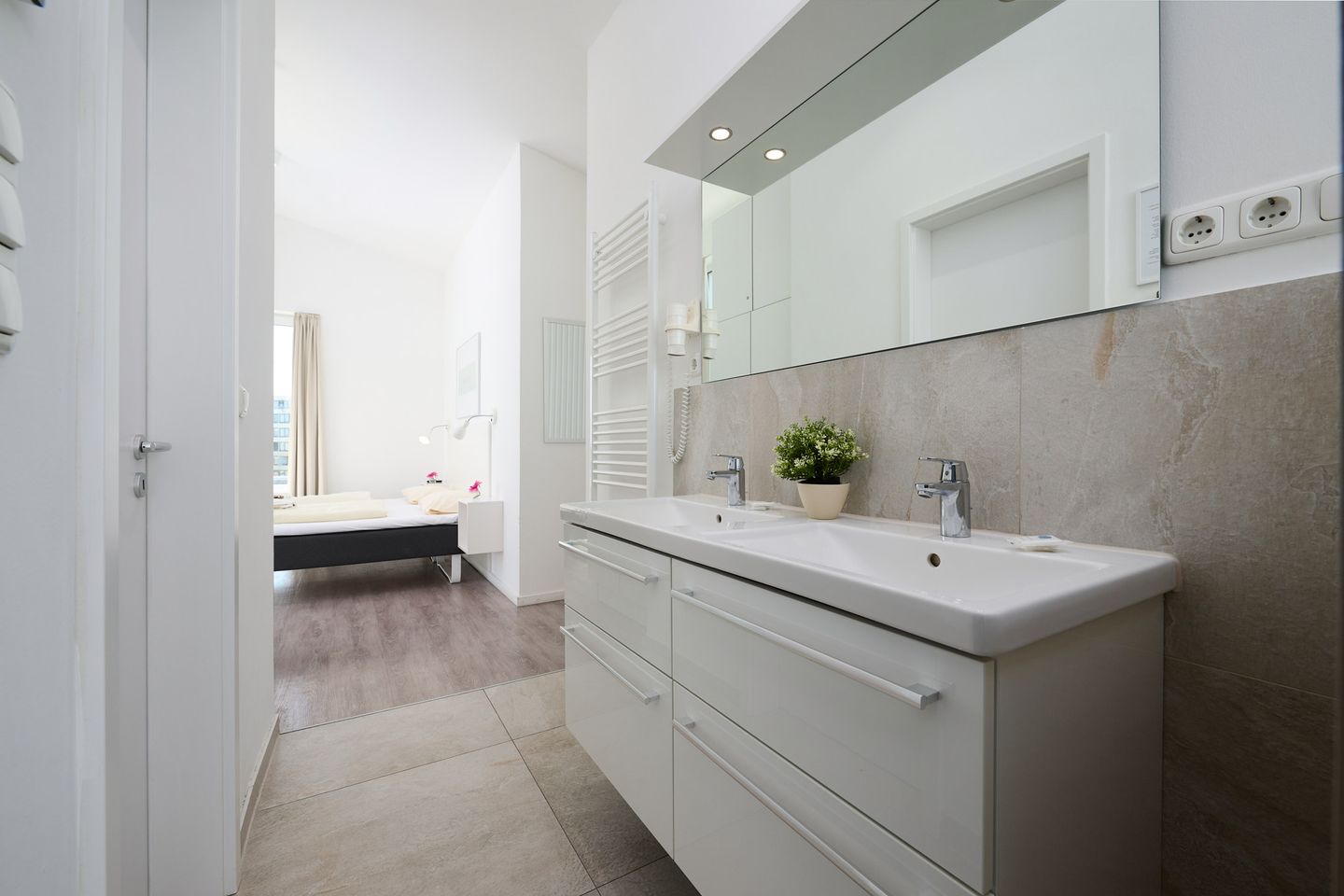Im zweiten Badezimmer finden Sie eine weitere Duschkabine und die finnische Sauna. Beide Bäder sind mit Fußbodenheizung ausgestattet.