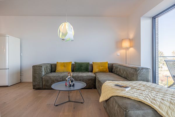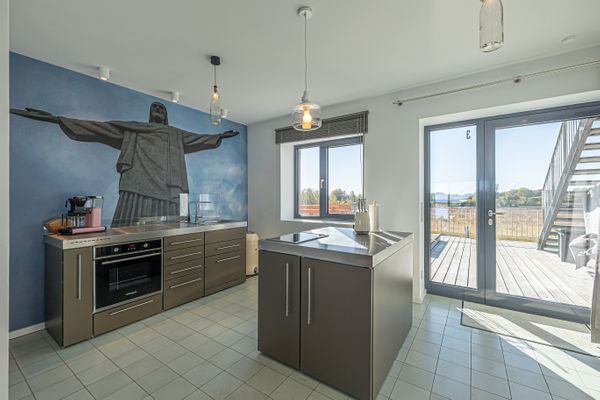 Die Ferienwohnung "Rooftop Garden 3" in Olpenitz begrüßt Sie in toller Lage direkt an der Hafenpromenade von Olpenitz und überzeugt auf ganzer Linie mit ihrer modernen Ausstattung und exklusiven Details. Mit einer Wohnfläche von 103 m² bieten sich ideale Voraussetzungen für bis zu 4 Personen und 2 Hunde, die Wert auf Komfort, Entspannung und ein stilvolles Interieur legen. Die Wohnung befindet sich im 1. Stock eines modernen Gebäudes und ist bequem über einen Aufzug erreichbar. Der offen gestaltete Wohn- und Essbereich bildet das Herzstück der Wohnung. Die moderne Küche ist zum Wohnzimmer hin offen gehalten und überzeugt durch eine umfassende Ausstattung: Neben einem Induktionsherd (2 Platten), Toaster und Spülmaschine finden Sie hier auch eine Espresso- und eine Kaffeemaschine, einen Sandwichmaker, Mixer und Pürierstab sowie sämtliche Küchenutensilien, Geschirr und Besteck für ein komfortables Kocherlebnis. Für gemütliche Stunden sorgt ein Kaminofen und eine Smart-TV im Wohnzimmer. Insgesamt verfügt die Ferienwohnung über zwei komfortable Schlafzimmer mit hochwertigen Möbeln. Bis zu vier Personen finden hier angenehme Schlafmöglichkeiten. Beide Schlafzimmer verfügen über je ein Doppelbett (180x200cm), einen Kleiderschrank, Verdunkelungsmöglichkeiten, Insektenschutzgitter sowie je ein Smart-TV. Für Familien stehen ein Kinderhochstuhl und ein Babybett bereit. Im Tageslicht-Bad erwartet Sie eine bodengleiche Dusche, ein Föhn sowie ein Kosmetikspiegel, zudem ist ein separates Gäste-WC vorhanden. Wellness-Liebhaber profitieren von einer finnischen Sauna, die ausschließlich exklusiv für Sie zur Verfügung steht. Für einen angenehmen Aufenthalt sorgen darüber hinaus WLAN, ein Soundsystem, Fußbodenheizung, Waschmaschine, Trockner sowie Bügeleisen und -brett. Besonders hervorzuheben ist der beeindruckende Meerblick, den Sie von Ihrem privaten Balkon genießen können. Zum Außenbereich zählt ebenfalls die gemeinschaftliche Dachterrasse, die mit Gartenmöbeln und einem Strandkorb ausgestattet ist, sodass Sie entspannte Stunden im Freien verbringen und das maritime Flair auf sich wirken lassen können. Ein Gasgrill steht zudem zur gemeinschaftlichen Nutzung zur Verfügung, um gesellige Grillabende zu erleben. Es kann außerdem der gemeinschaftliche, abschließbare Fahrradschuppen genutzt werden. Der zur Wohnung gehörende Privatparkplatz vor der Unterkunft sowie ein Carport und eine Elektroauto-Ladestation stehen Ihnen zur Verfügung. Ferner erreichen Sie Einkaufsmöglichkeiten und Restaurants in unmittelbarer Umgebung. Die Vielfalt an Freizeitgestaltungsmöglichkeiten in der Umgebung ist bemerkenswert: Angeln, Segeln, Schwimmen, Radfahren, Nordic Walking, Wasserski und zahlreiche weitere Aktivitäten lassen keine Wünsche offen. Genießen Sie in dieser exklusiven Ferienwohnung einen angenehmen Aufenthalt in erstklassiger Lage mit umfassender, moderner Ausstattung und maritimem Ambiente.