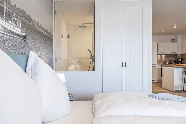 Mit direktem Wasserblick und in einzigartiger Lage direkt an der Schlei bietet die „Schlei-Koje 4“ am Pionierhafen Schleswig den perfekten Ort für Ihren Urlaub. Die Ferienwohnung im 1. OG bietet auf ca. 45m² einen offenen Wohn- und Essbereich mit Küche und angrenzendem offenen Schlafzimmer, ein Badezimmer und einen Balkon. Die vollausgestattete Küche lässt keine Wünsche offen und im Wohnzimmer können Sie Ihre Urlaubstage auf dem Sofa vor dem Smart-TV ausklingen lassen. Das Schlafzimmer bietet ein gemütliches Doppelbett (180x200cm) sowie Verdunklungsmöglichkeiten für erholsame Nächte. In dem Badezimmer finden Sie einen Föhn und eine Dusche vor. Auf dem Balkon können Sie sich entspannen und an lauen Abenden Ihre Urlaubstage ausklingen lassen. Ein eigener Parkplatz steht Ihnen direkt vor dem Haus zur Verfügung. Ihre Fahrräder können Sie im offenen gemeinschaftlich genutzten Fahrradraum unterstellen. Im Erdgeschoss steht eine Waschmaschine zur gemeinschaftlichen Nutzung kostenfrei für Sie zur Verfügung. Am Pionierhafen wird Wert auf Nachhaltigkeit gelegt, daher wird 77 % der Energie durch Erdwärme bezogen. Durch die einzigartige Lage am Ostseefjord Schlei kann auch ein Boot mitgebracht und auf einem Liegeplatz gegen Gebühr direkt am Pionierhafen angelegt werden. Bitte sprechen Sie uns hierfür an.