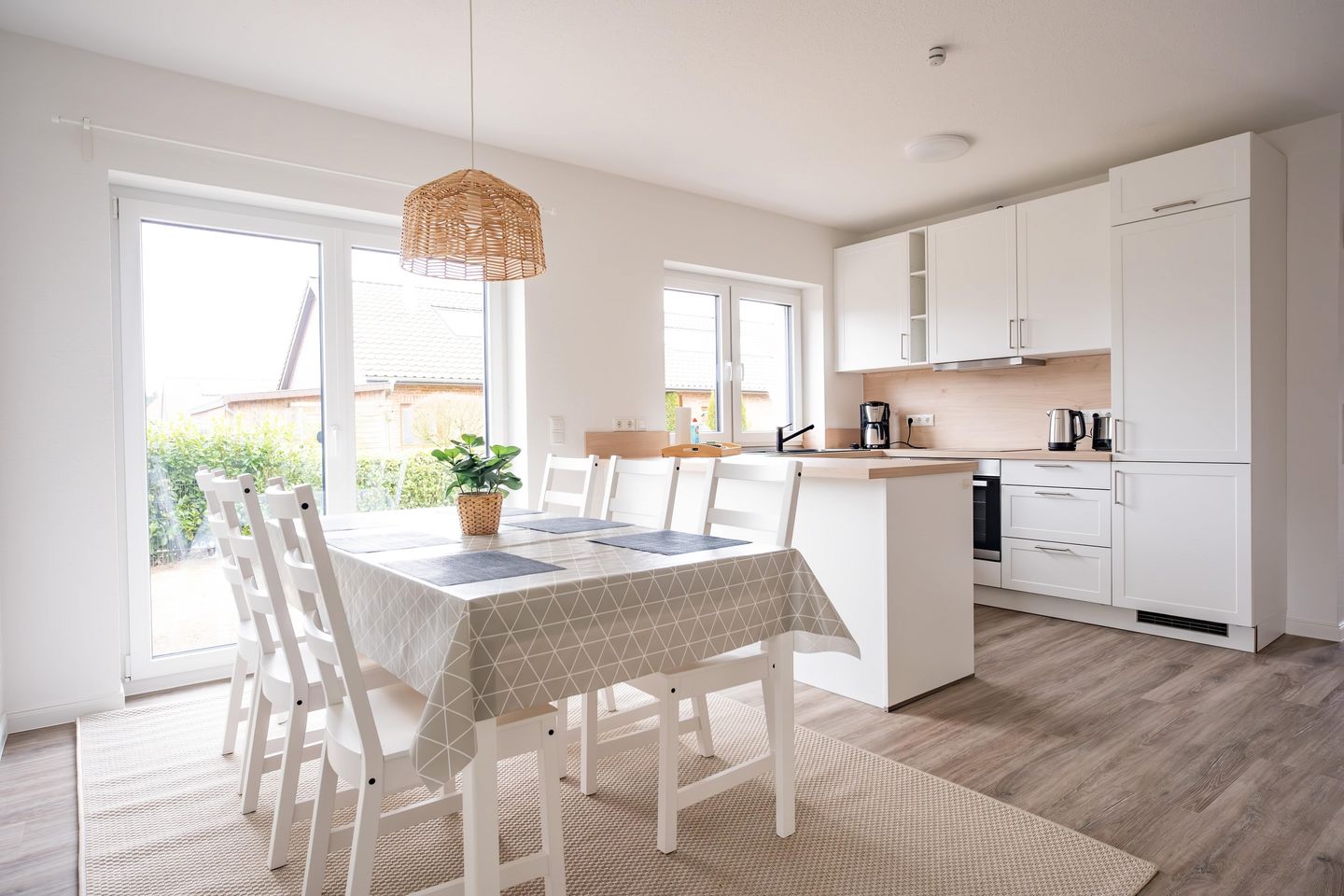 Das Ferienhaus erstreckt sich über drei Etagen und überzeugt durch helle, großzügige Wohn- und Essbereiche. Das Wohnzimmer mit bequemer Sofaecke lädt zum Entspannen ein – ausgestattet mit Flachbildfernseher (Sat-TV) und Fußbodenheizung, damit Sie sich rundum wohlfühlen.