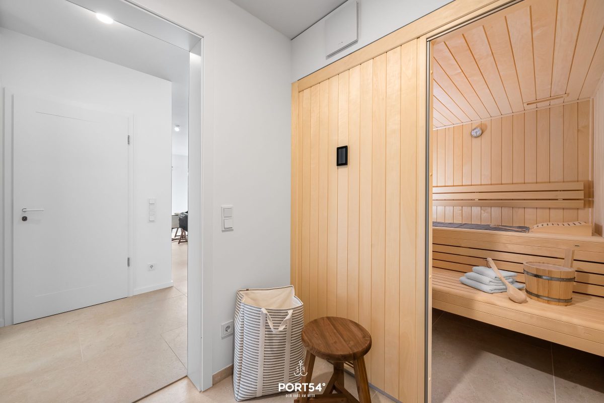 Besondere Wohlfühlmomente bietet die private Finnische Sauna mit angrenzender Dusche, während die Fußbodenheizung im gesamten Haus für ein angenehmes Raumklima sorgt. Die Badezimmer sind hochwertig ausgestattet und verfügen über zwei bodengleiche Duschen, sowie eine Badewanne. Ergänzt wird dies durch moderne Waschbecken, WCs, Spiegel, Kosmetikspiegel und Haartrockner. Bettwäsche, Handtücher sowie eine Erstausstattung sind bereits inklusive.