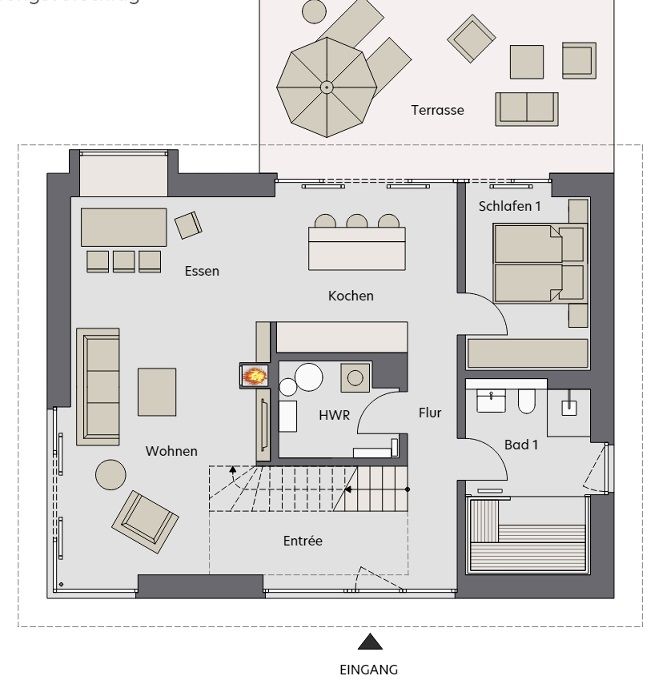 Der Außenbereich überzeugt mit einer Terrasse, einem Garten sowie gemütlichen Gartenmöbeln.