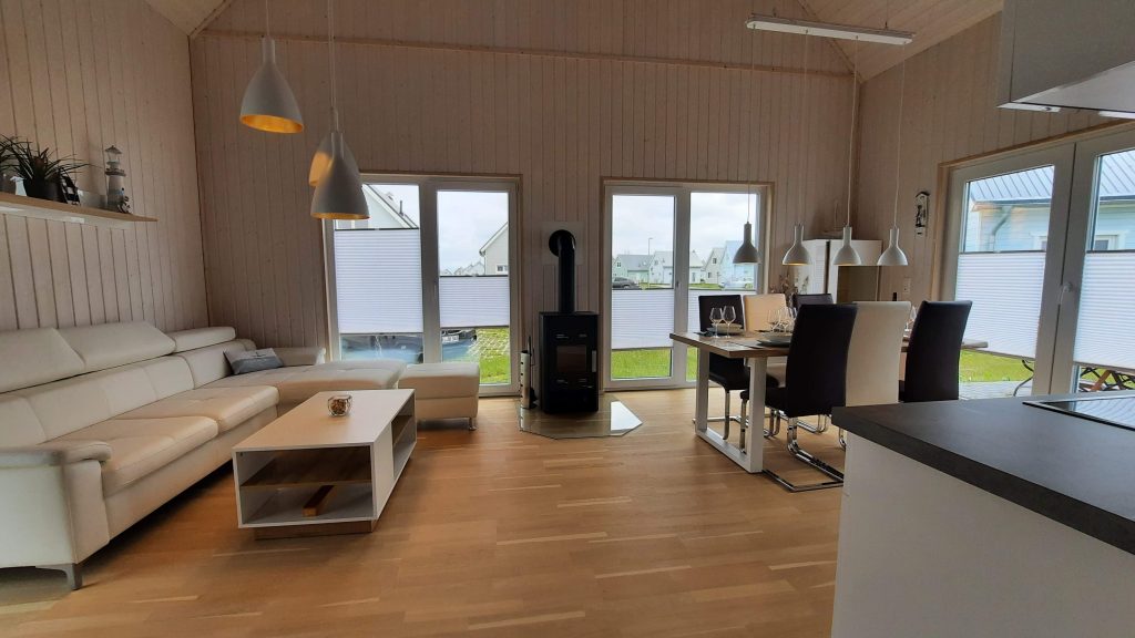 Das freistehende Haus verfügt über einen offenen Wohn- und Essbereich, eine Küche, drei Schlafzimmer sowie zwei Bäder. Nach langen Strandspaziergängen kannst Du auf dem gemütlichen Sofa vor dem Kamin entspannen und Deine Lieblingsserie auf dem Flachbild-TV schauen.