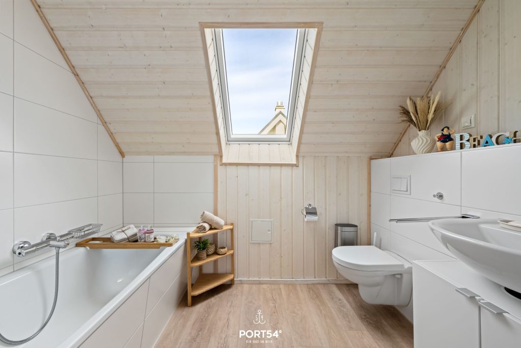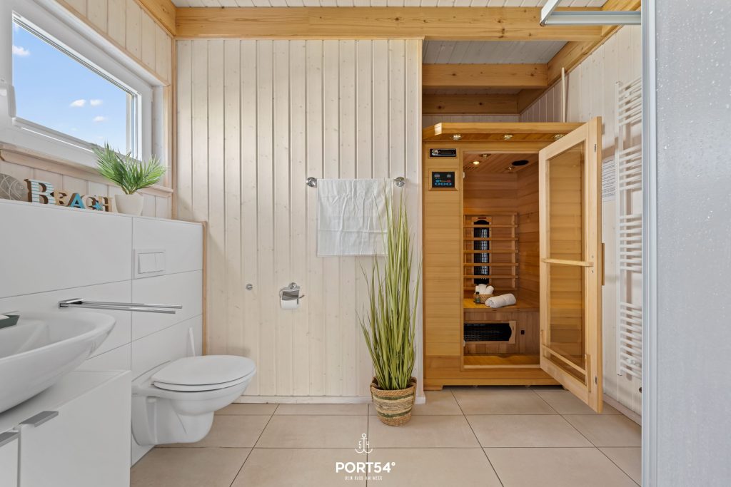 Ein Badezimmer befindet sich im Erdgeschoss und ist mit einer Dusche und dem Highlight: einer Infrarot-Sauna ausgestattet. Hier kannst Du Dich an kalten Tagen aufwärmen und entspannen! Das andere Badezimmer befindet sich im Obergeschoss und bietet eine Duschwanne sowie einen Föhn.