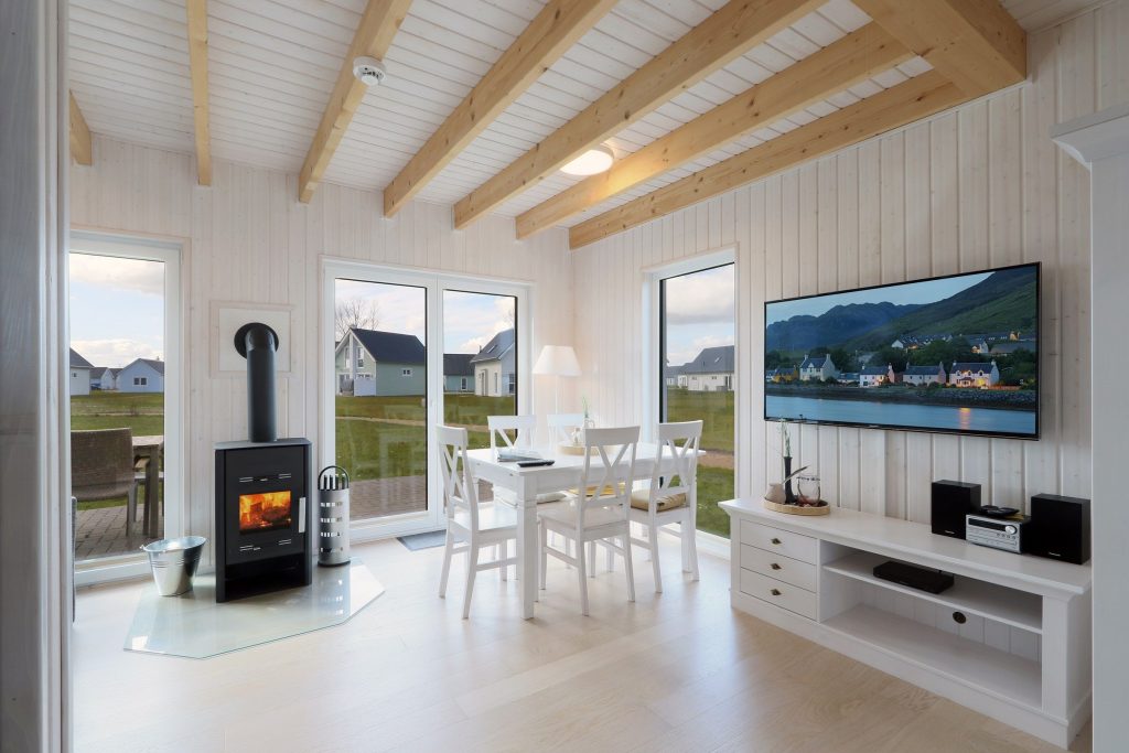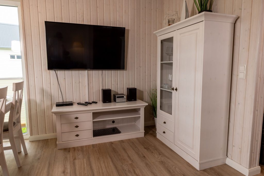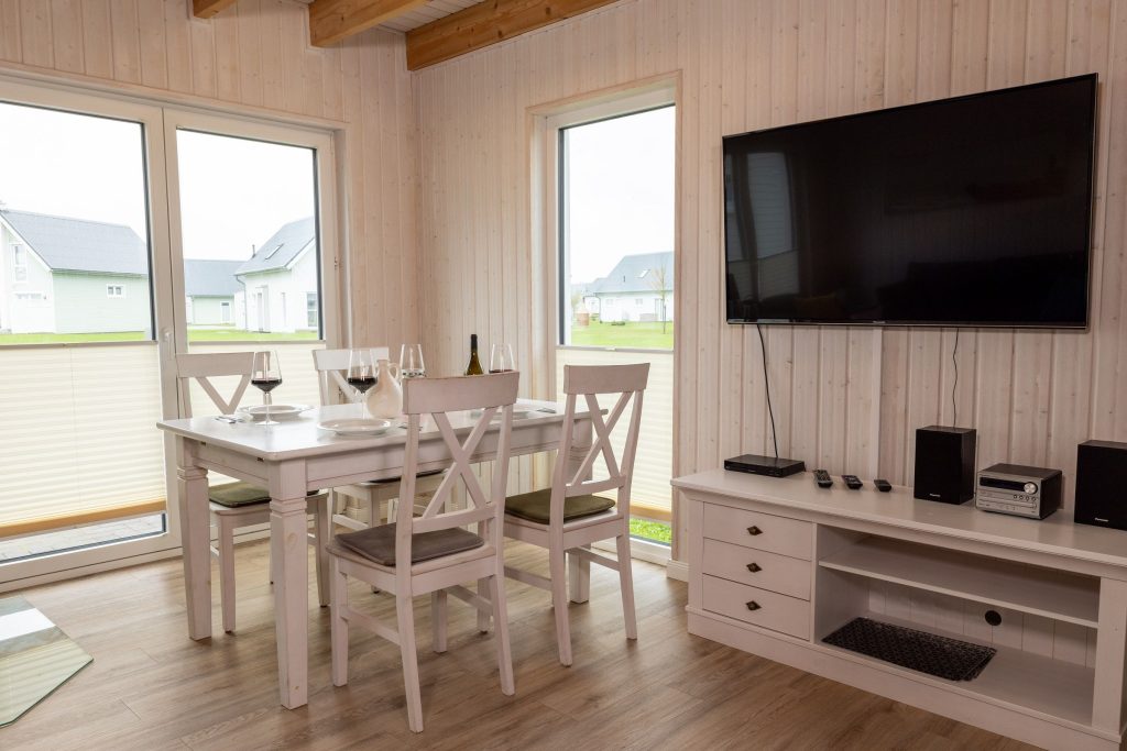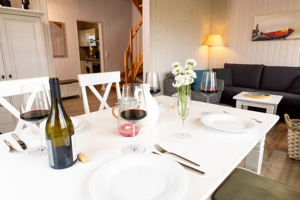 Entspanne Dich auf dem Sofa vor dem Flachbild-TV oder lasse Deine Urlaubstage auf der Terrasse ausklingen. Das Sofa im Wohnbereich lässt sich zu einem Schlafsofa (140 x 200 cm) umfunktionieren und bietet somit 2 weitere Schlafplätze für Kinder. An den kühleren Tagen sorgt der Kaminofen im Wohnbereich für eine gemütliche Wärme. In der vollausgestatteten Küche lassen sich leckere Gerichte zaubern.
