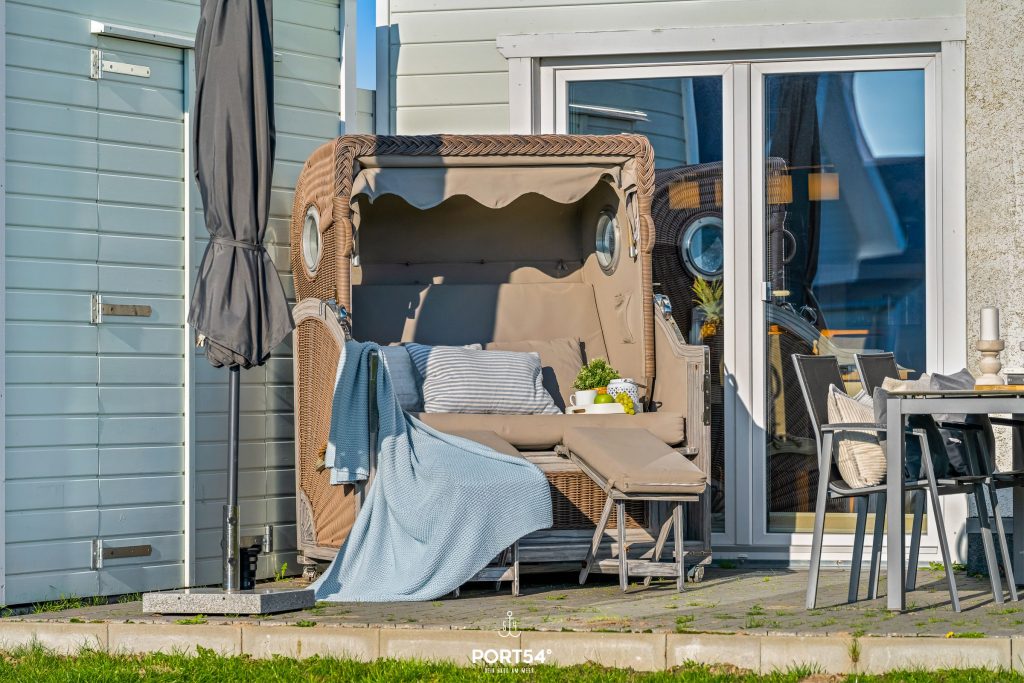 An sonnigen Tagen kannst Du es Dir auf der möblierten Terrasse gemütlich machen. Die Sonnenliegen laden zum Relaxen ein und an lauen Sommerabenden kannst Du die Tage auf der Terrasse ausklingen lassen.
