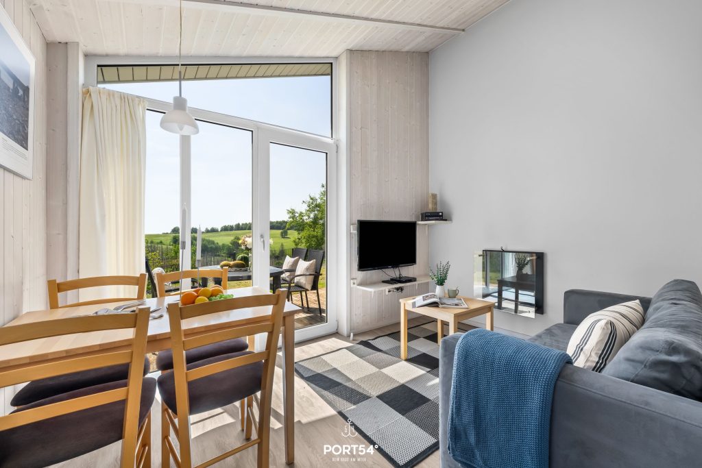 Der offene Wohnbereich bildet das Herzstück des Hauses. Mit seiner gemütlichen Couch, rustikalen Holzelementen und einem Bio-Ethanol-Kaminofen lädt er zu entspannten Abenden in wohliger Atmosphäre ein. Große Fenster holen die umliegende Natur ins Innere und lassen den Raum lichtdurchfluten. Hier kannst du auf der Couch entspannen, ein Buch lesen oder bei einer Tasse Tee den Ausblick genießen. Ein Flachbild-TV und eine Musikanlage sorgen für zusätzliche Unterhaltung.