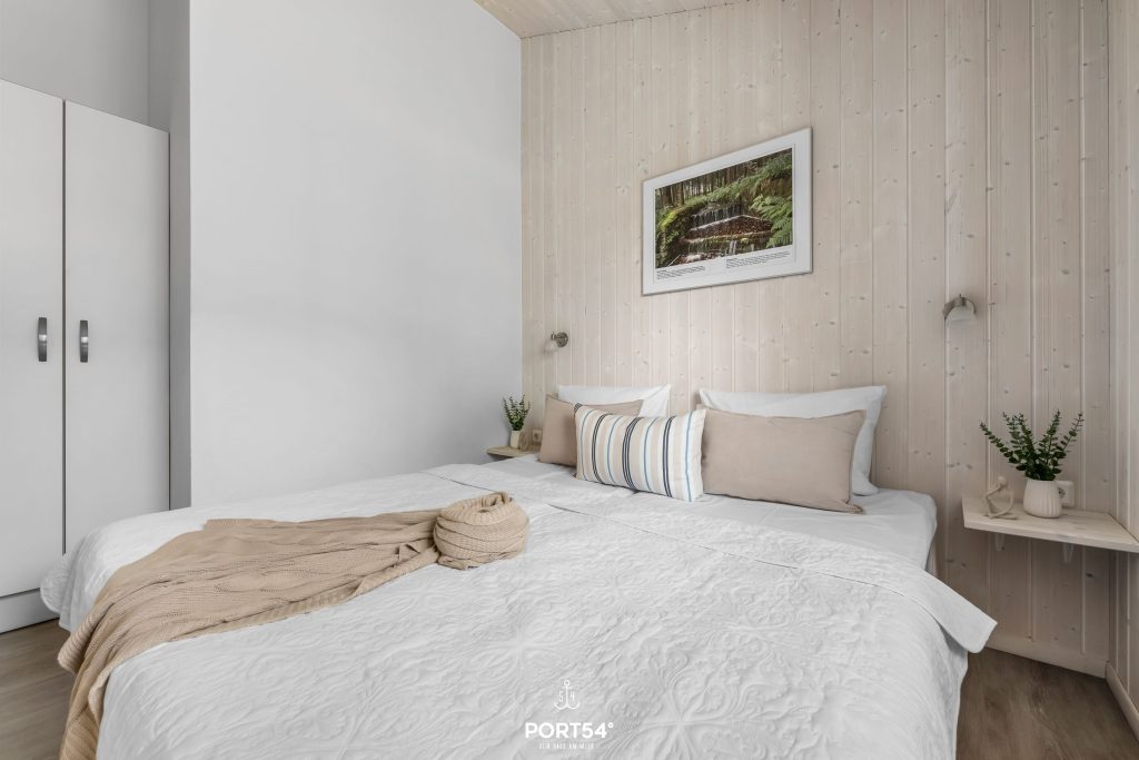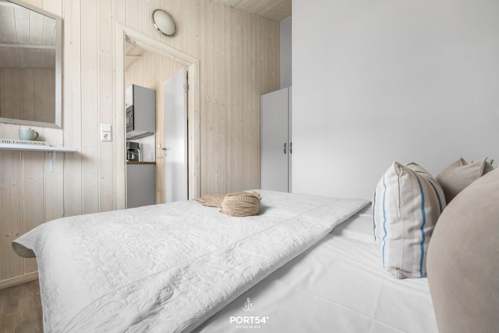 Das Schlafzimmer bietet mit zwei zusammengeschobenen Einzelbetten (zusammen 180 x 200 cm) einen behaglichen Rückzugsort für zwei Erwachsene. Natürliche Materialien und dezente Farben sorgen für ein entspannendes Ambiente. Für zusätzliche Gäste steht im Wohnbereich eine ausziehbare Schlafcouch (140 x 190 cm) bereit, die zwei Personen – ideal für Kinder oder Freunde – bequem Platz bietet. Bettwäsche und Handtücher können optional hinzu gebucht werden.
