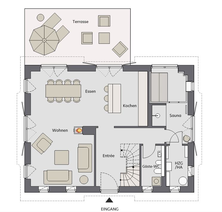 Der Außenbereich überzeugt mit einer Terrasse, einem Garten sowie gemütlichen Gartenmöbeln.