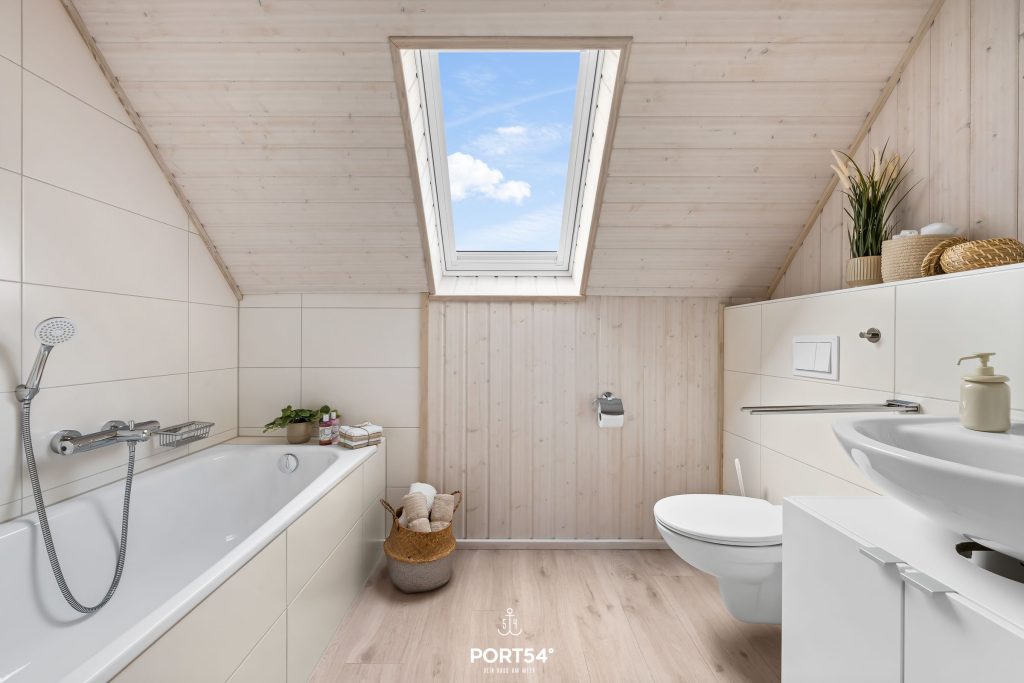 Ein Badezimmer befindet sich im Erdgeschoss und ist mit einer ebenerdigen Dusche, einem Handtuchtrockner und dem Highlight: einer Infrarot-Sauna ausgestattet. Hier kannst Du Dich an kalten Tagen aufwärmen und entspannen! Das andere Badezimmer im ersten Obergeschoss bietet eine Duschwanne, ebenfalls einen Handtuchtrockner sowie einen Föhn.