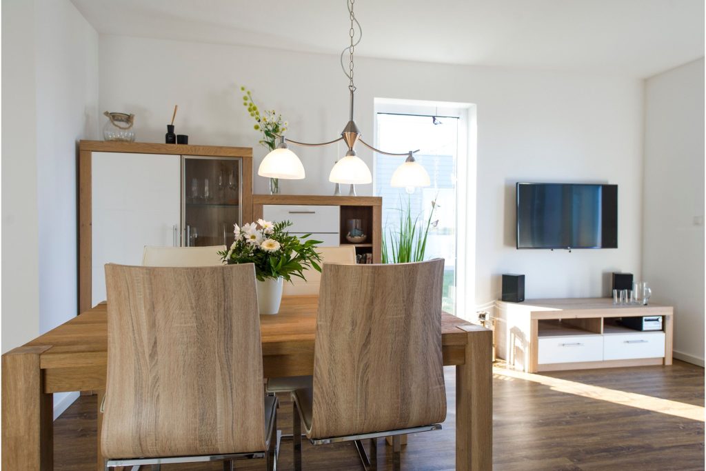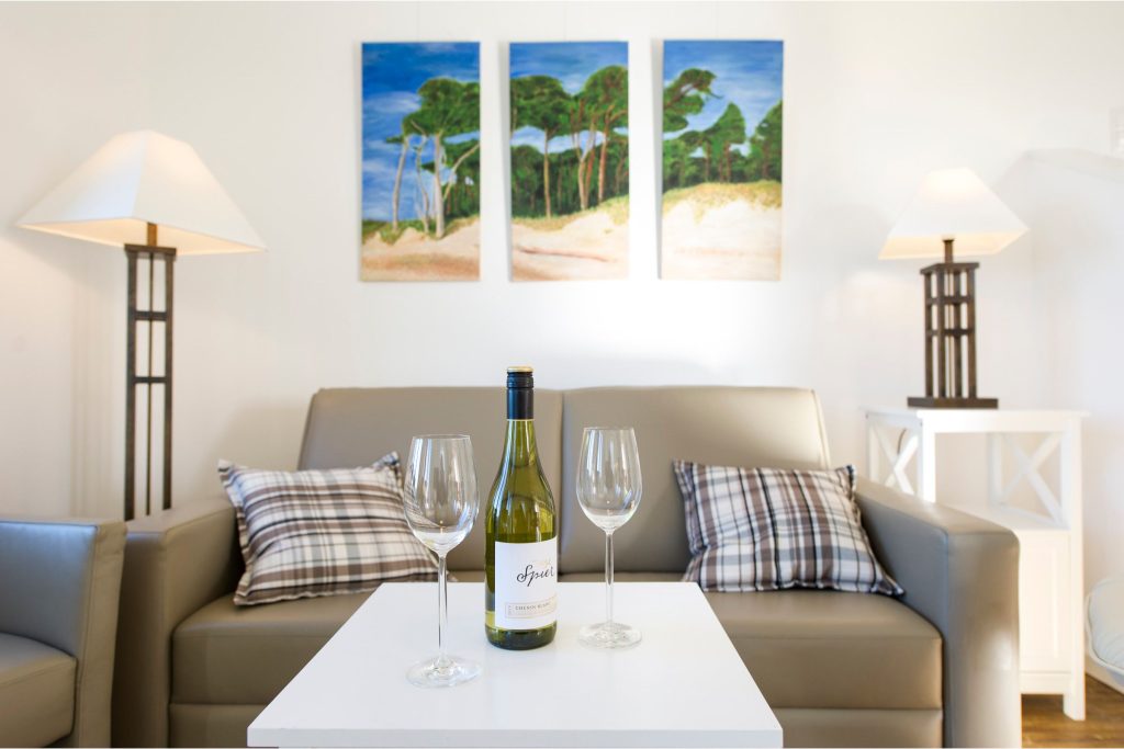 Das modern eingerichtete Ferienhaus bietet Dir ein offenes Wohnzimmer mit großem Sofa und Kamin, um gemütliche Abende am wärmenden Feuer ausklingen zu lassen. Von hier aus hast Du ebenfalls Zugang zur Terrasse.