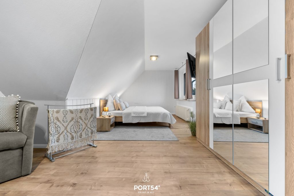 Im Obergeschoss befinden sich 2 weitere Schlafzimmer (180x200cm und 90x200cm), eins davon mit Zugang zu einem kleinen Balkon und dem Duschbad. Auf dem Grundstück gibt es Platz für bis 2 PKWs und ein Fahrradschuppen (nicht abschließbar) ist für Ihre mitgebrachten Fahrräder vorhanden. Für die ganz kleinen Gäste steht Ihnen ein Kinderbett, ein Hochstuhl und ein Wickeltisch zur Verfügung.