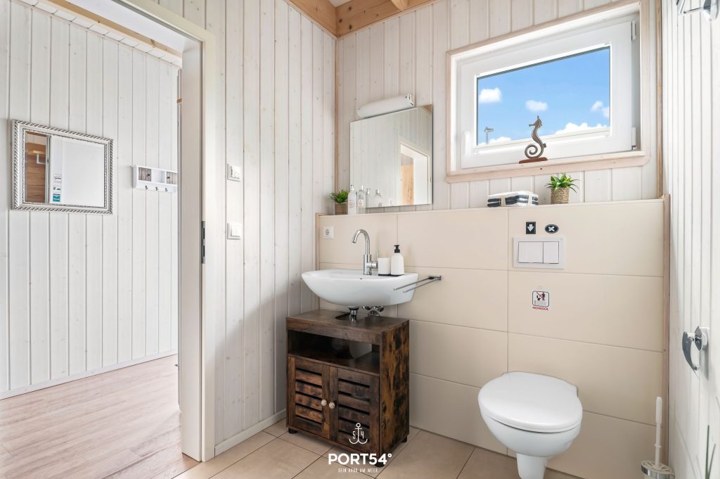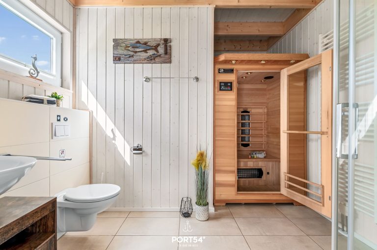 Ein Bad rundet das Erdgeschoss ab. Das Badezimmer verfügt über ein Fenster mit Sichtschutz, eine Dusche, eine Handtuchheizung und als besonderes Highlight eine Infrarotsauna. Hier kannst Du Dich nach langen Strandspaziergängen aufwärmen und entspannen.
