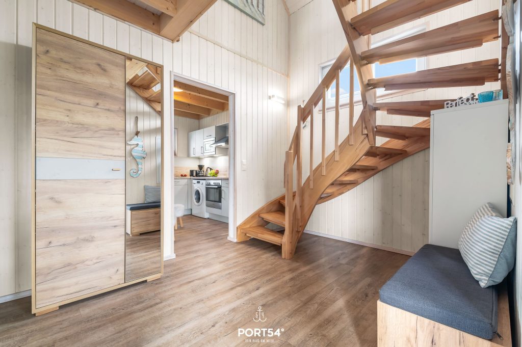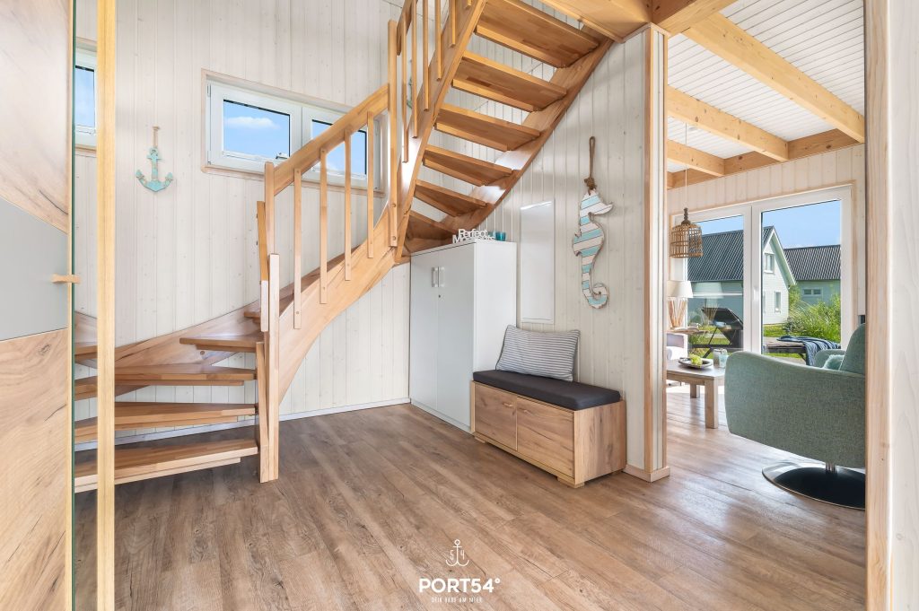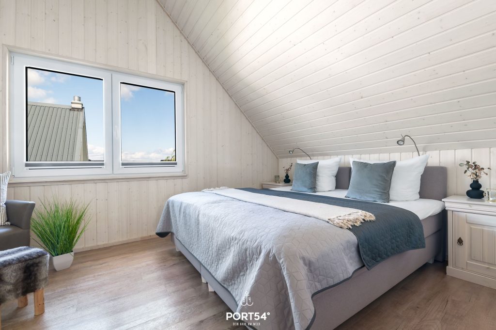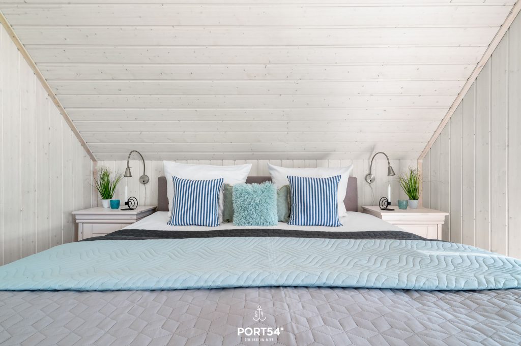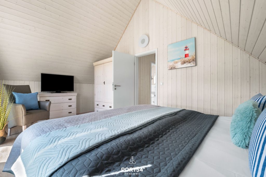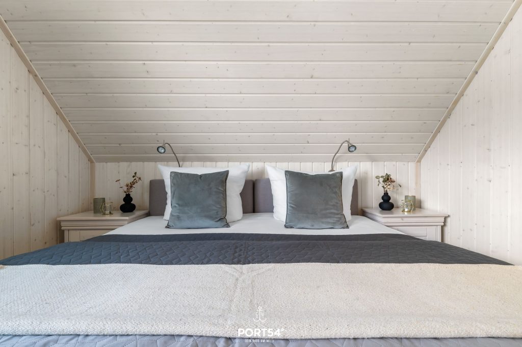 Im Obergeschoss befinden sich zwei Schlafzimmer. Eines der beiden Zimmer bietet ein gemütliches, großes Boxspringbett (180x200 cm) und einen Schrank, das zweite Schlafzimmer ist mit zwei Boxspringbetten (90x200 cm) sowie ebenfalls mit einem Schrank ausgestattet. Beide Zimmer verfügen über Verdunkelungsmöglichkeiten und Insektenschutz, sodass einem erholsamen Schlaf nichts im Wege steht.