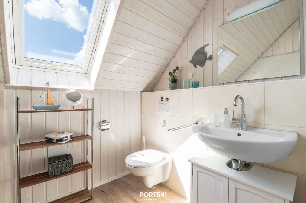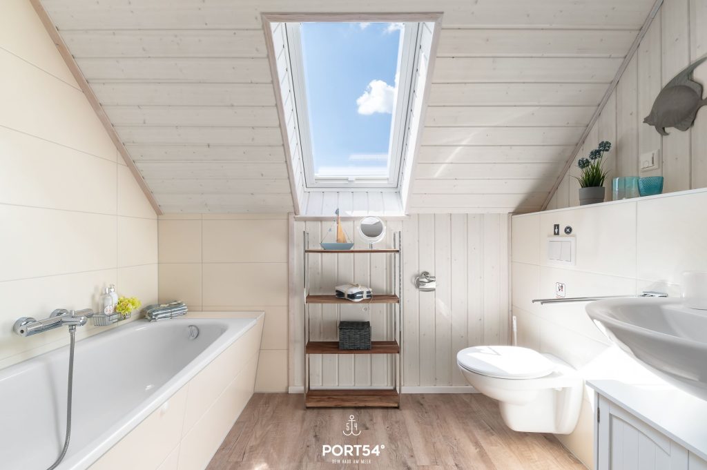 Das Bad im Obergeschoss bietet ein Dachfenster mit Sichtschutz, eine Badewanne, eine Handtuchheizung, einen Föhn und ein weiteres WC.