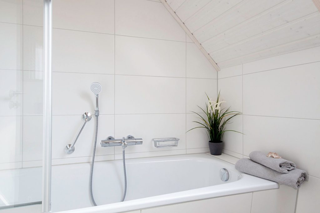 Das andere Badezimmer befindet sich im Obergeschoss und bietet eine Duschwanne und einen Föhn.