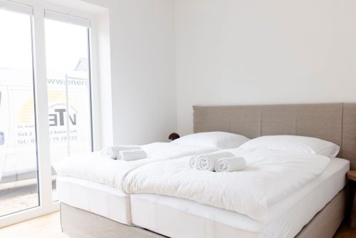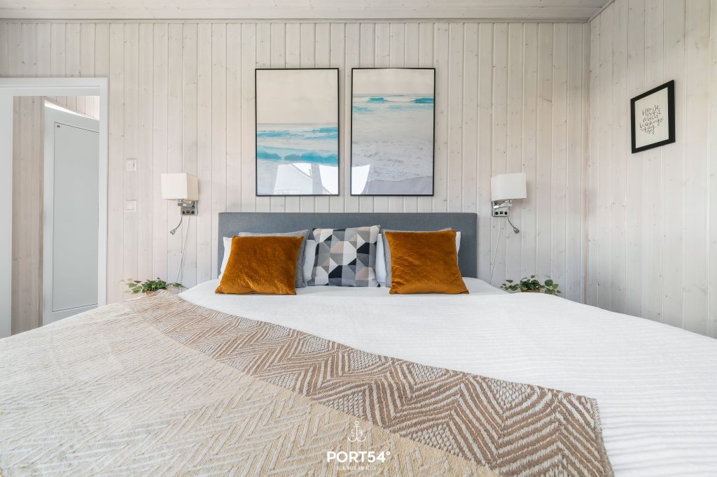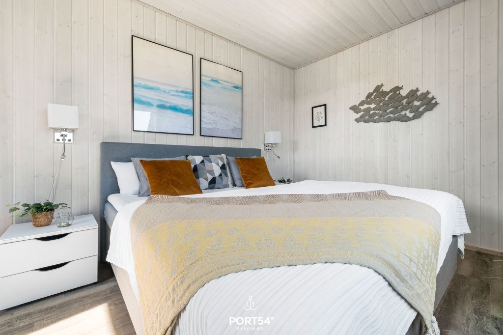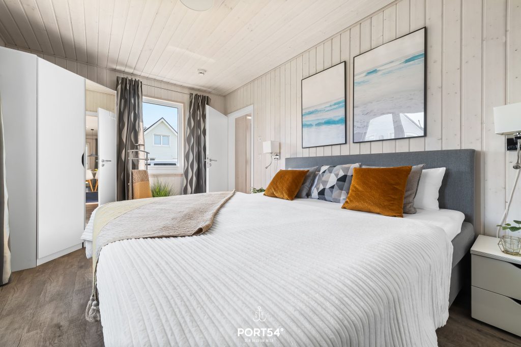 Das Schlafzimmer bietet ein gemütliches King-Size-Boxspring-Doppelbett (200 x 200 cm), einen Kleiderschrank, eine Kommode sowie einen Flachbild-TV. Die Fenster verfügen über eine Verdunkelungsmöglichkeit, somit steht einem erholsamen Schlaf nichts mehr im Wege.