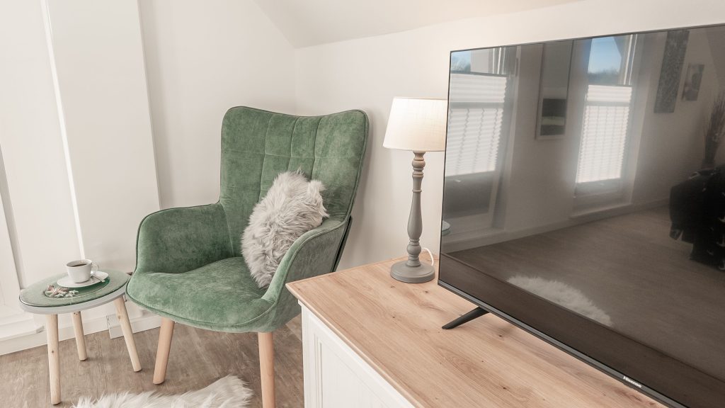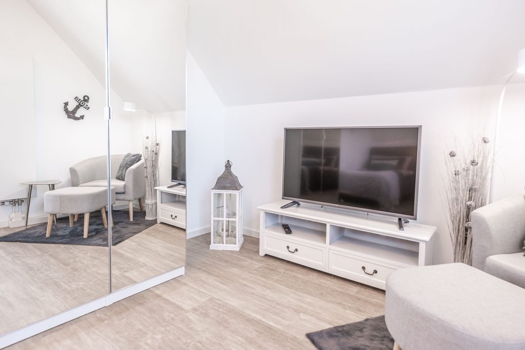 Eines der beiden Schlafzimmer ist mit einem komfortablen Doppelbett (180 x 200 cm) ausgestattet, das andere mit zwei Einzelbetten (je 90 x 200 cm). Beide Schlafzimmer sind komplett verdunkelbar und verfügen zusätzlich über Flachbild-TVs, sodass du beste Voraussetzungen für erholsame Nächte und entspannte Rückzugsmomente hast.