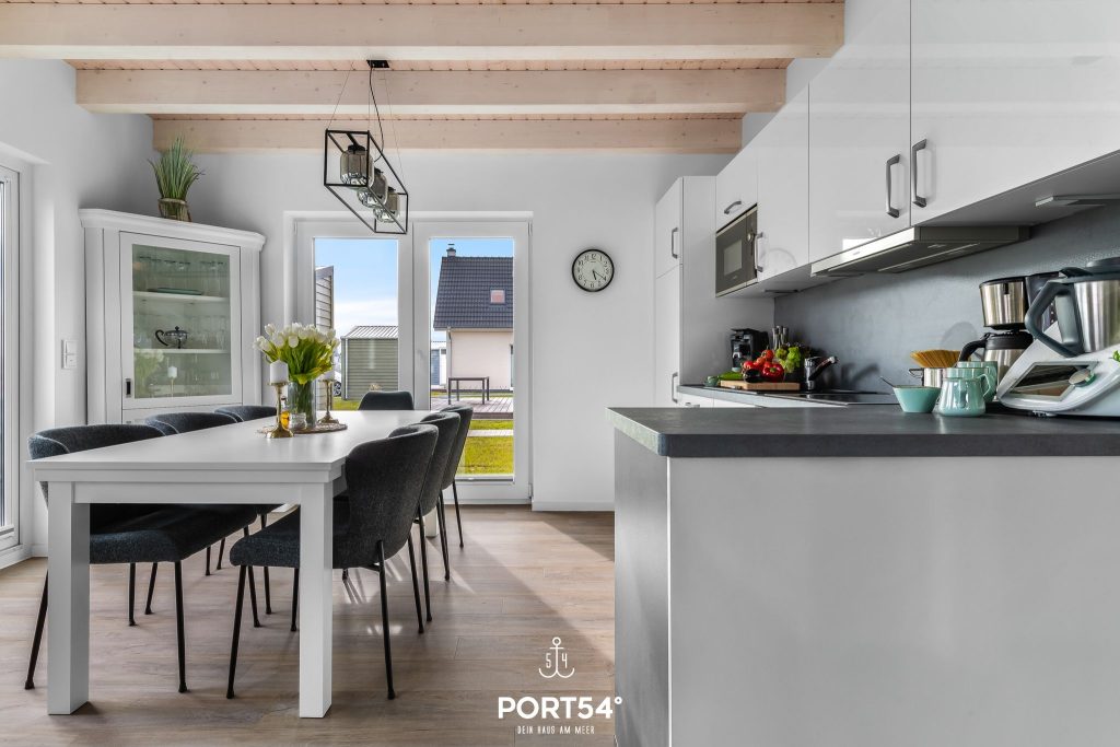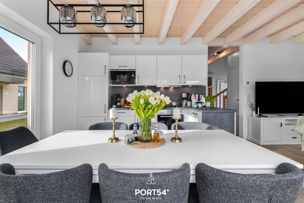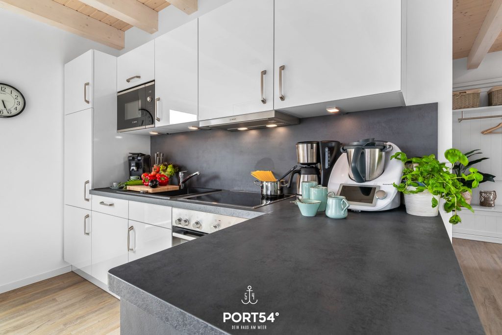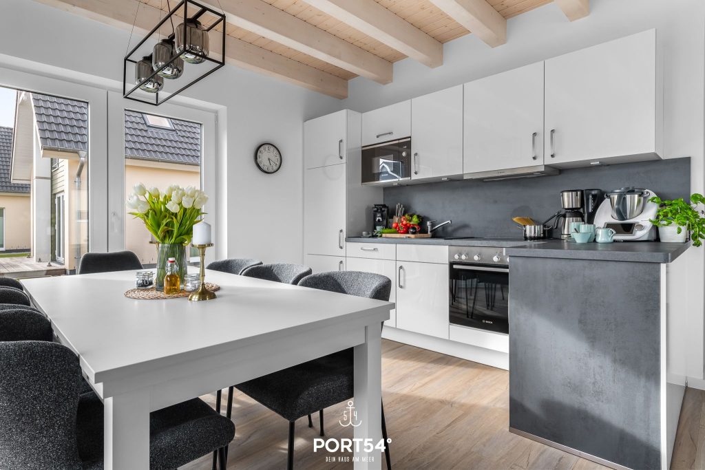 Der offene Wohn- und Essbereich lädt zum Entspannen und Verweilen ein. Eine gemütliche Sofaecke sowie ein großer Esstisch bieten ausreichend Platz für gemeinsame Stunden. Die moderne, offene Küche ist umfassend ausgestattet und bietet Dir alles, was Du für Deinen Aufenthalt benötigst, darunter Cerankochfeld, Backofen, Mikrowelle, Kühlschrank mit Gefrierfach, Spülmaschine sowie Kaffeemaschine, Senseo Padmaschine, Wasserkocher, Toaster und weiteres Küchenzubehör.