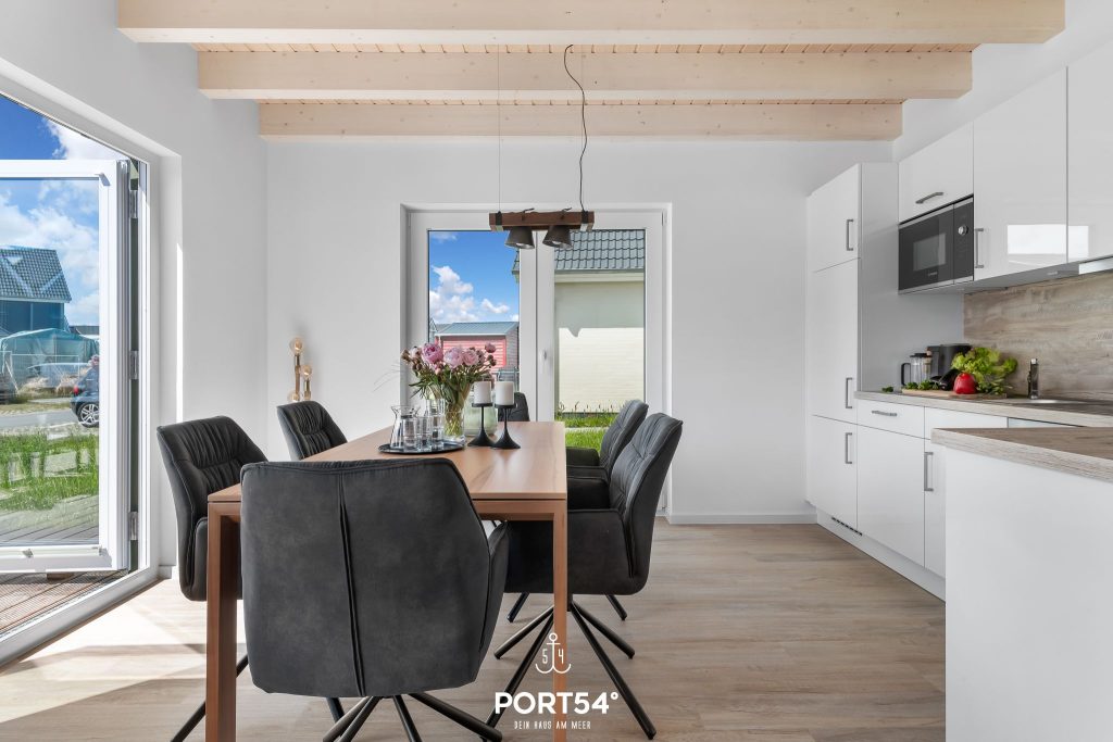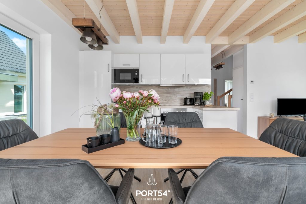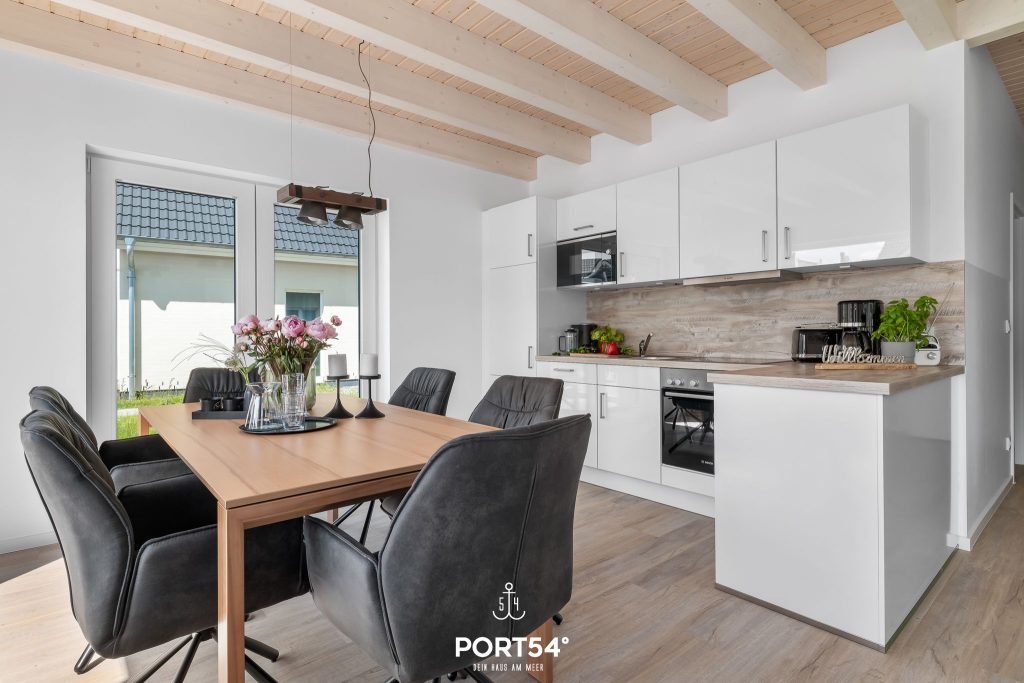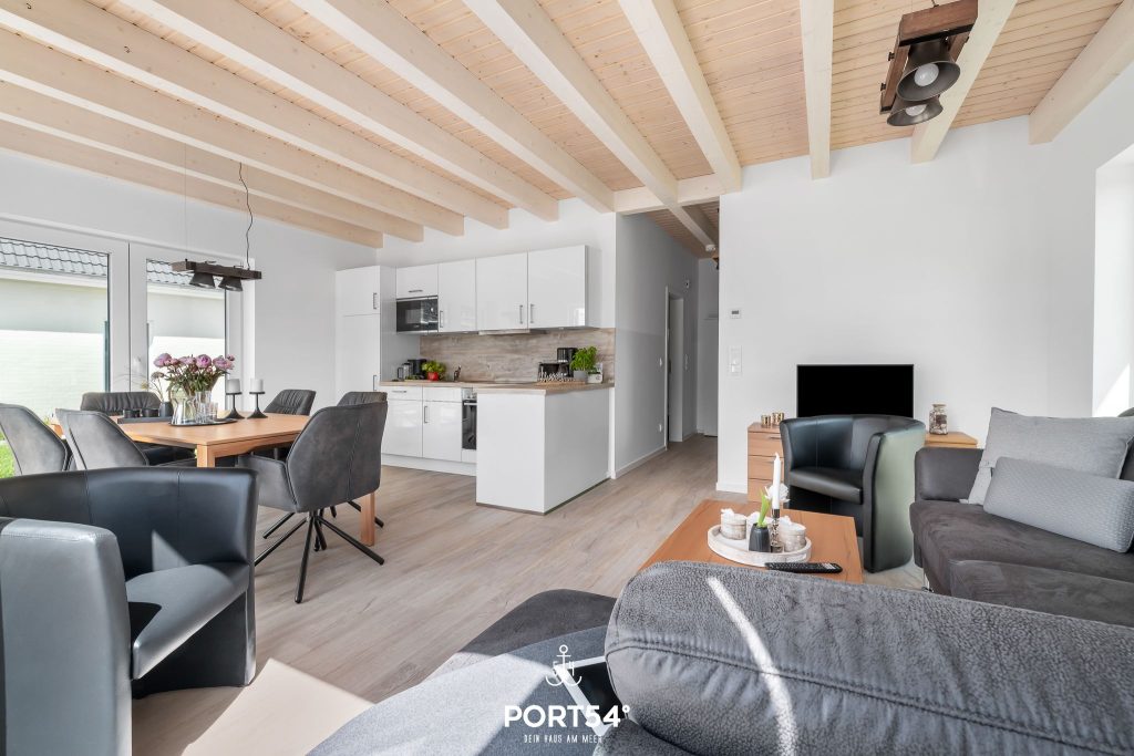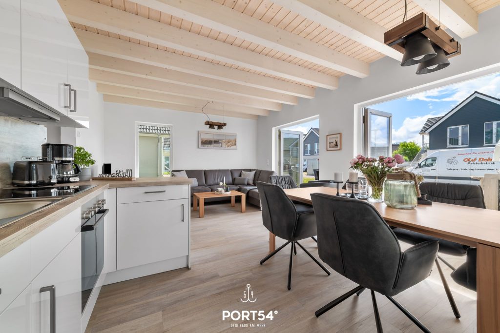 Für Behaglichkeit sorgt die Fußbodenheizung in Kombination mit der Zentralheizung, während der Kaminofen im Wohnbereich zu gemütlichen Stunden einlädt. Die offene Küche ist modern ausgestattet mit Backofen, Ceran-Herd, Mikrowelle, Kühlschrank mit Gefrierfach, Kaffeemaschine, Wasserkocher und Toaster. Geschirr, Besteck und Küchenutensilien sind selbstverständlich vorhanden, und die Spülmaschine erleichtert den Alltag im Urlaub. Ein Essbereich mit großem Tisch bietet Platz für gemeinsame Mahlzeiten, während die Sofaecke zum Entspannen oder geselligen Beisammensein einlädt.