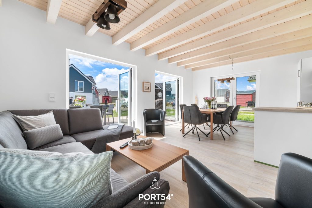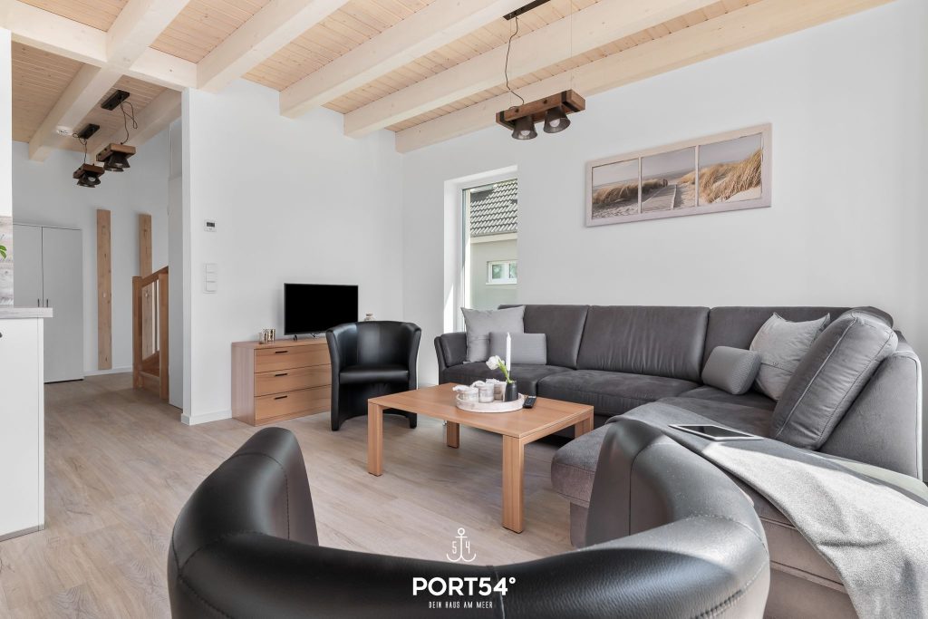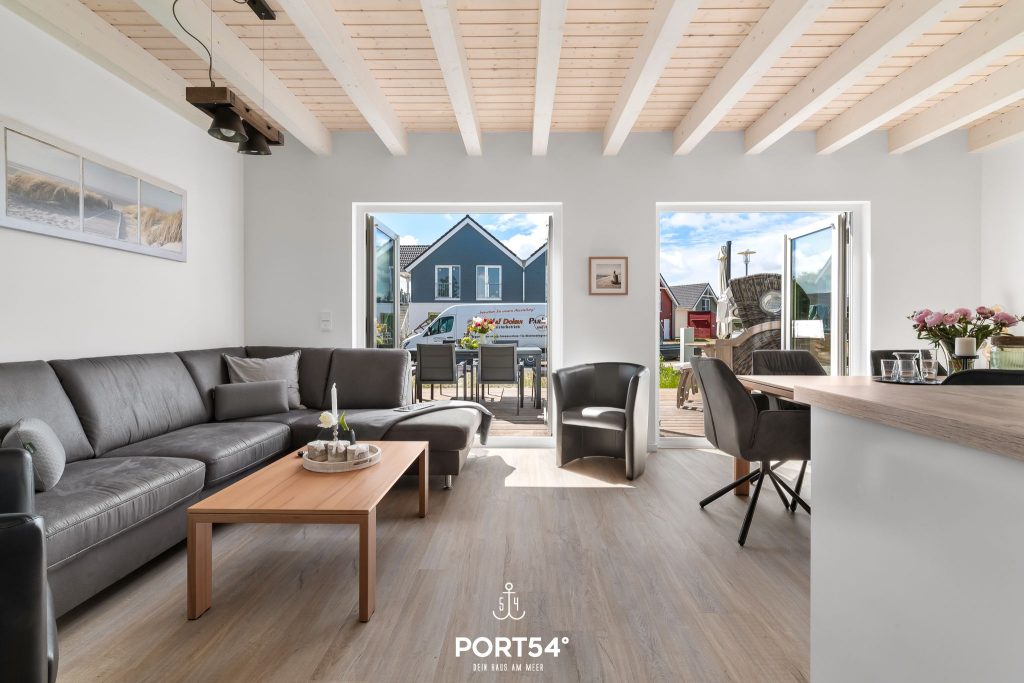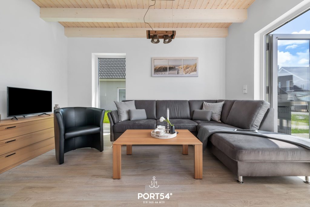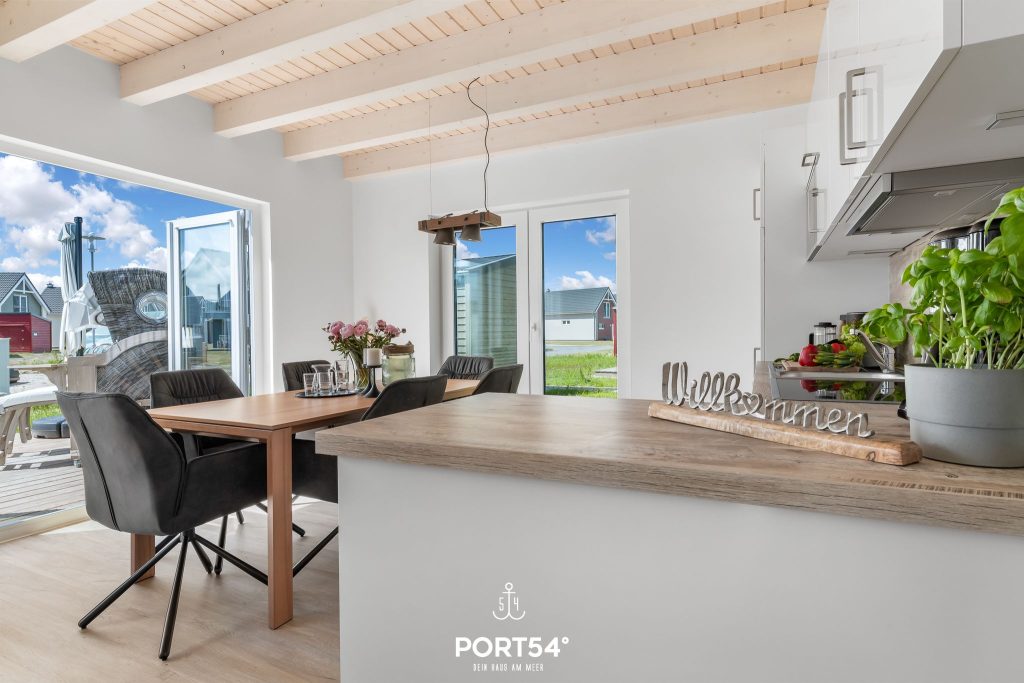 Für Behaglichkeit sorgt die Fußbodenheizung in Kombination mit der Zentralheizung, während der Kaminofen im Wohnbereich zu gemütlichen Stunden einlädt. Die offene Küche ist modern ausgestattet mit Backofen, Ceran-Herd, Mikrowelle, Kühlschrank mit Gefrierfach, Kaffeemaschine, Wasserkocher und Toaster. Geschirr, Besteck und Küchenutensilien sind selbstverständlich vorhanden, und die Spülmaschine erleichtert den Alltag im Urlaub. Ein Essbereich mit großem Tisch bietet Platz für gemeinsame Mahlzeiten, während die Sofaecke zum Entspannen oder geselligen Beisammensein einlädt.