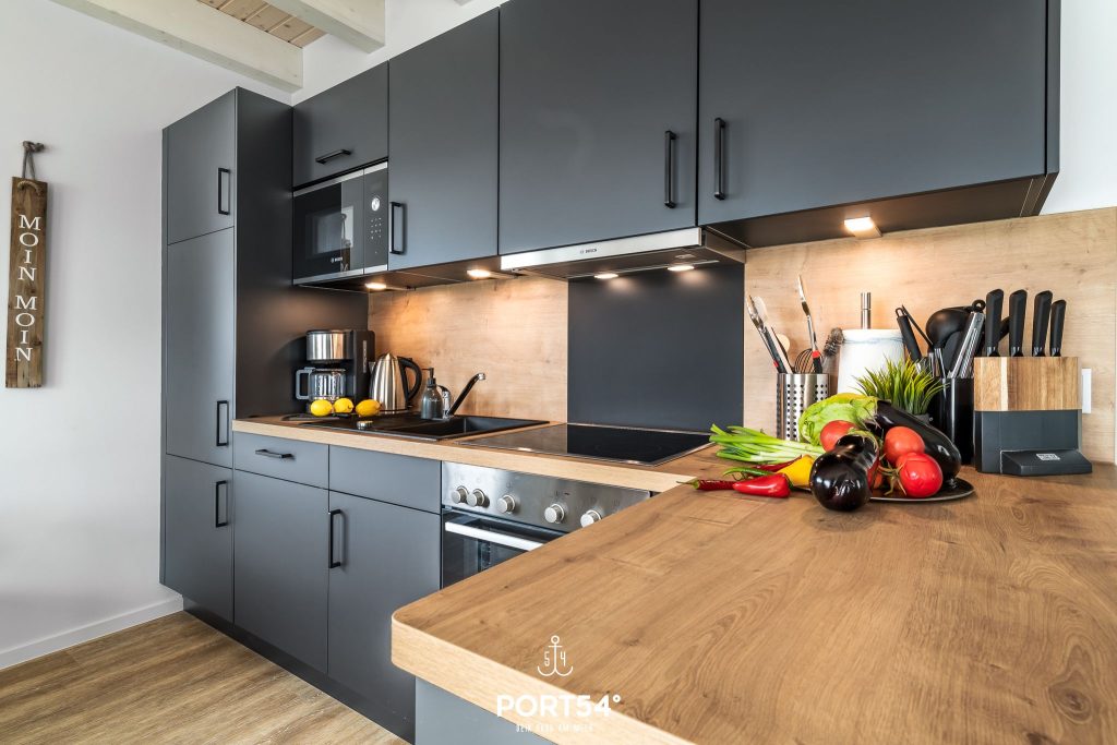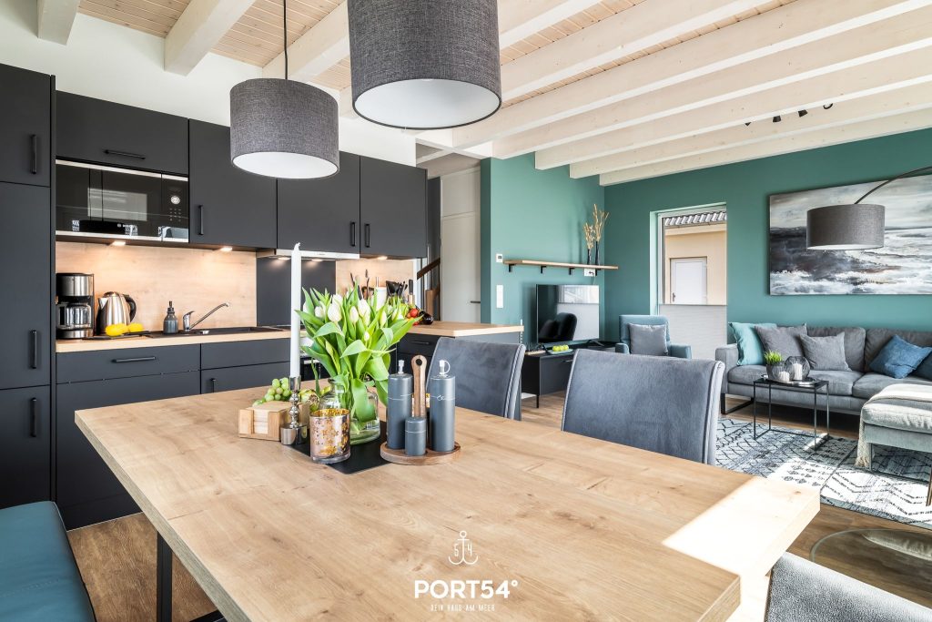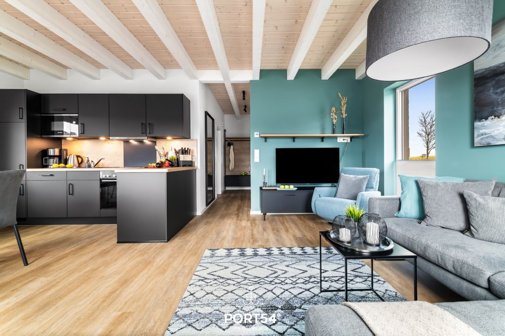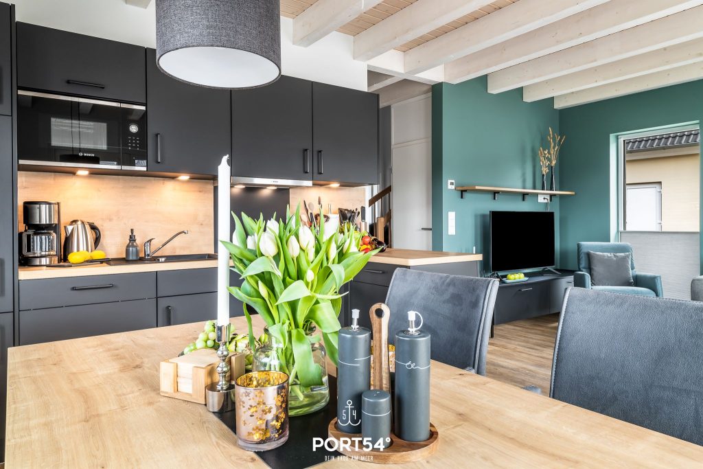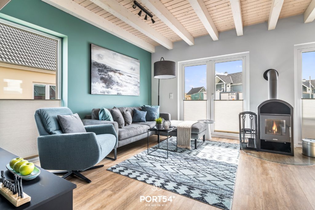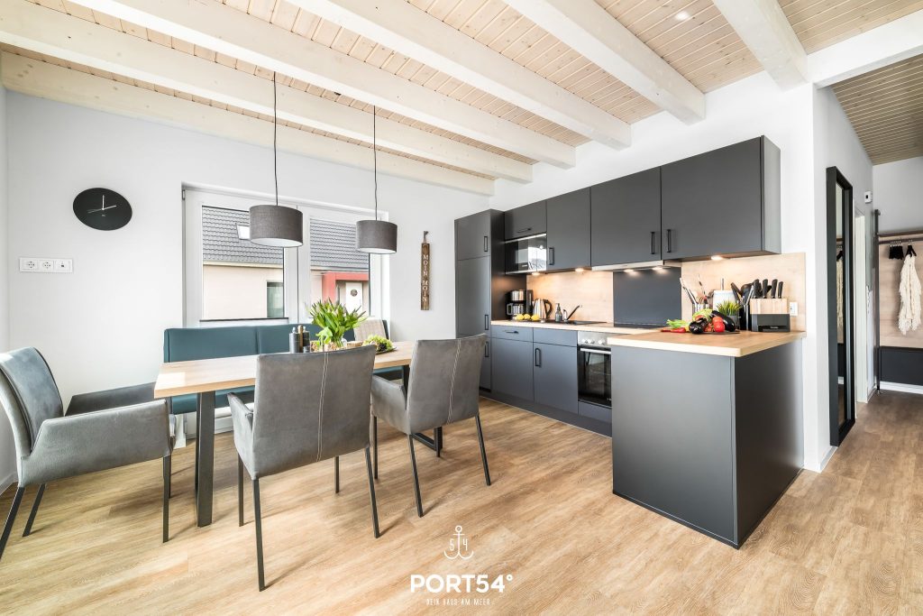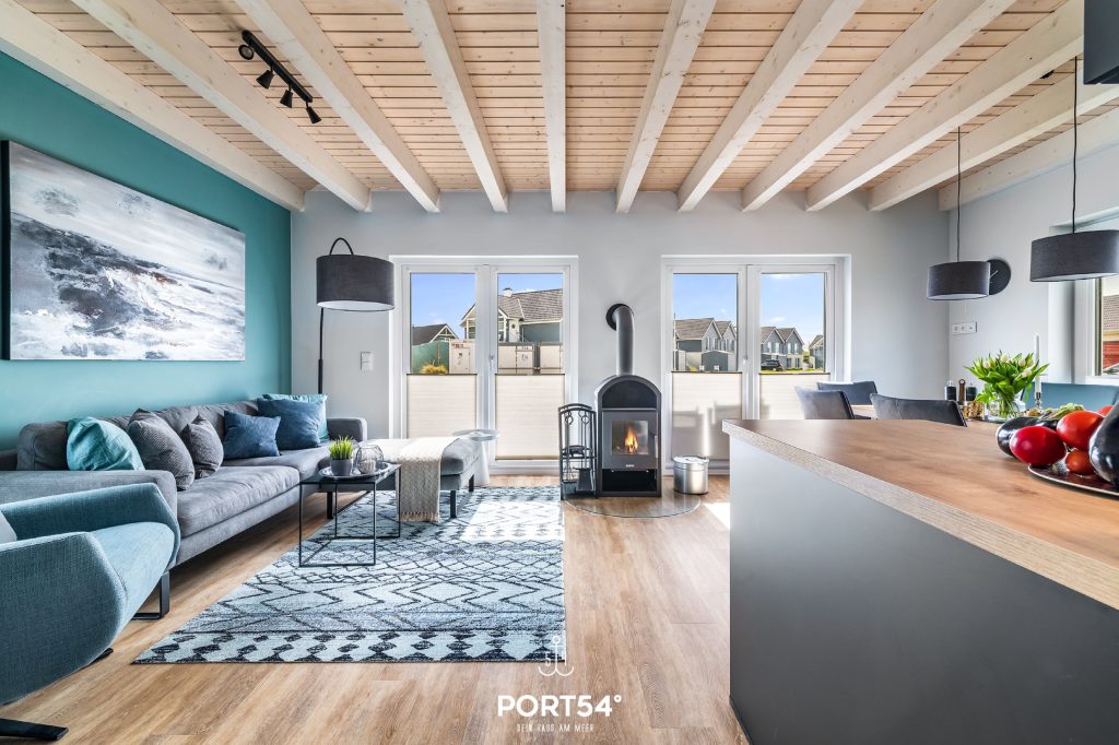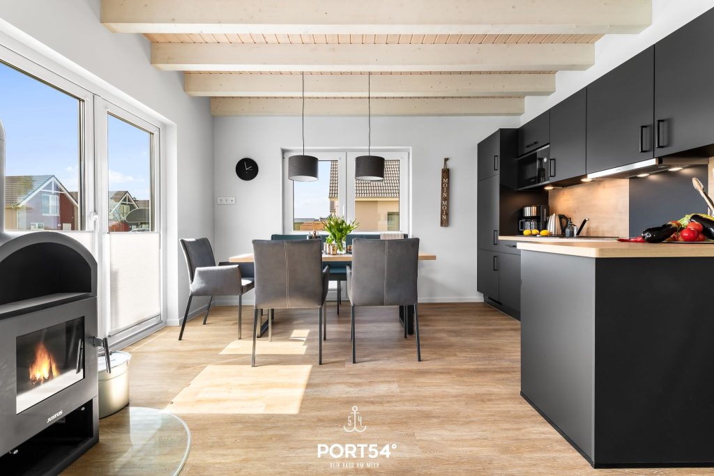 Der Wohnbereich im Erdgeschoss ist hell, offen und einladend gestaltet. Die offene Küche zum Wohnzimmer ist komplett ausgestattet mit Backofen, Ceranherd, Kühlschrank mit Gefrierfach, Mikrowelle, Spülmaschine, Kaffeemaschine und Toaster – alles, was Du für entspannte Mahlzeiten brauchst, ist vorhanden. Der angrenzende Essbereich mit Esstisch bietet Platz für gemeinsame Stunden, während die Sofaecke, bequeme Sessel und der Kaminofen zu gemütlichen Abenden einladen. WLAN und TV mit digitalem Anschluss sorgen für Unterhaltung, die Fußbodenheizung macht das Haus auch an kühleren Tagen angenehm warm.