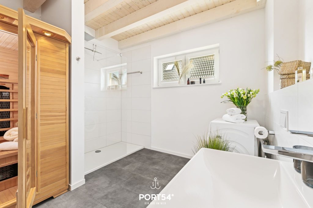 Für Deinen Alltag findest Du alles, was Du brauchst – von Waschmaschine über Bügeleisen bis hin zu Wäscheständer und Staubsauger. Die modernen Badezimmer verfügen über bodengleiche Duschen. Ein besonderes Highlight ist die Infrarotkabine, die Dir private Wellnessmomente direkt im Haus ermöglicht.