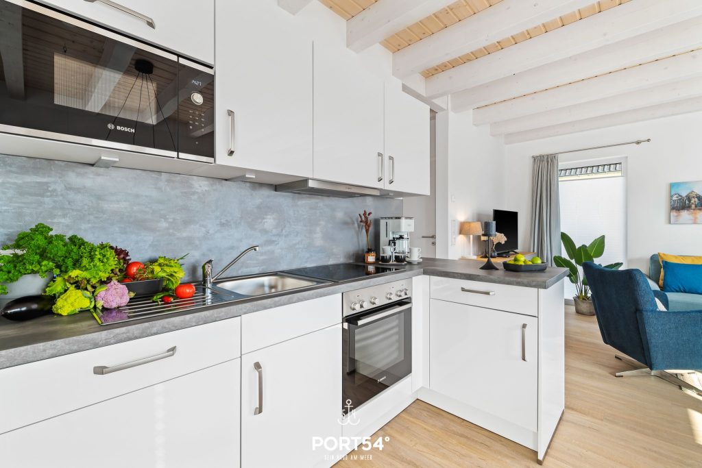 Die offene Küche ist direkt mit dem Wohn- und Essbereich verbunden und bestens ausgestattet: Backofen, Mikrowelle, Kühlschrank mit Gefrierfach, Geschirrspüler, Kaffeemaschine, Toaster und Wasserkocher stehen bereit. Geschirr, Besteck und Kochutensilien sind selbstverständlich vorhanden. Am Esstisch kannst Du Deine Mahlzeiten entspannt genießen.