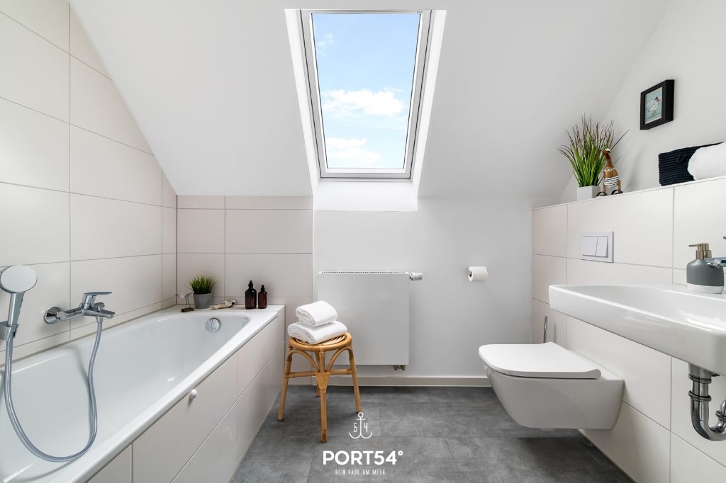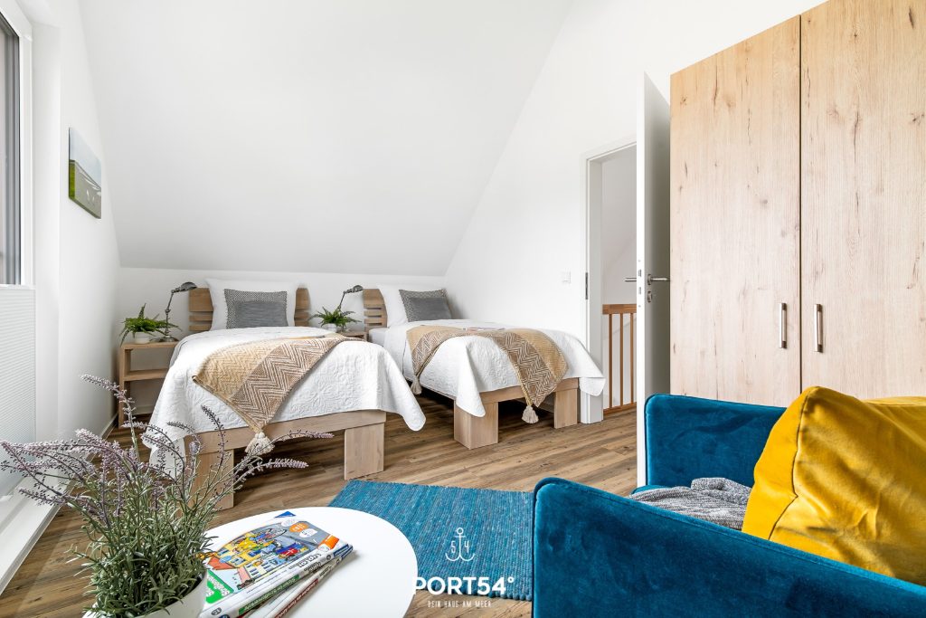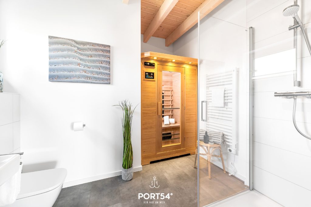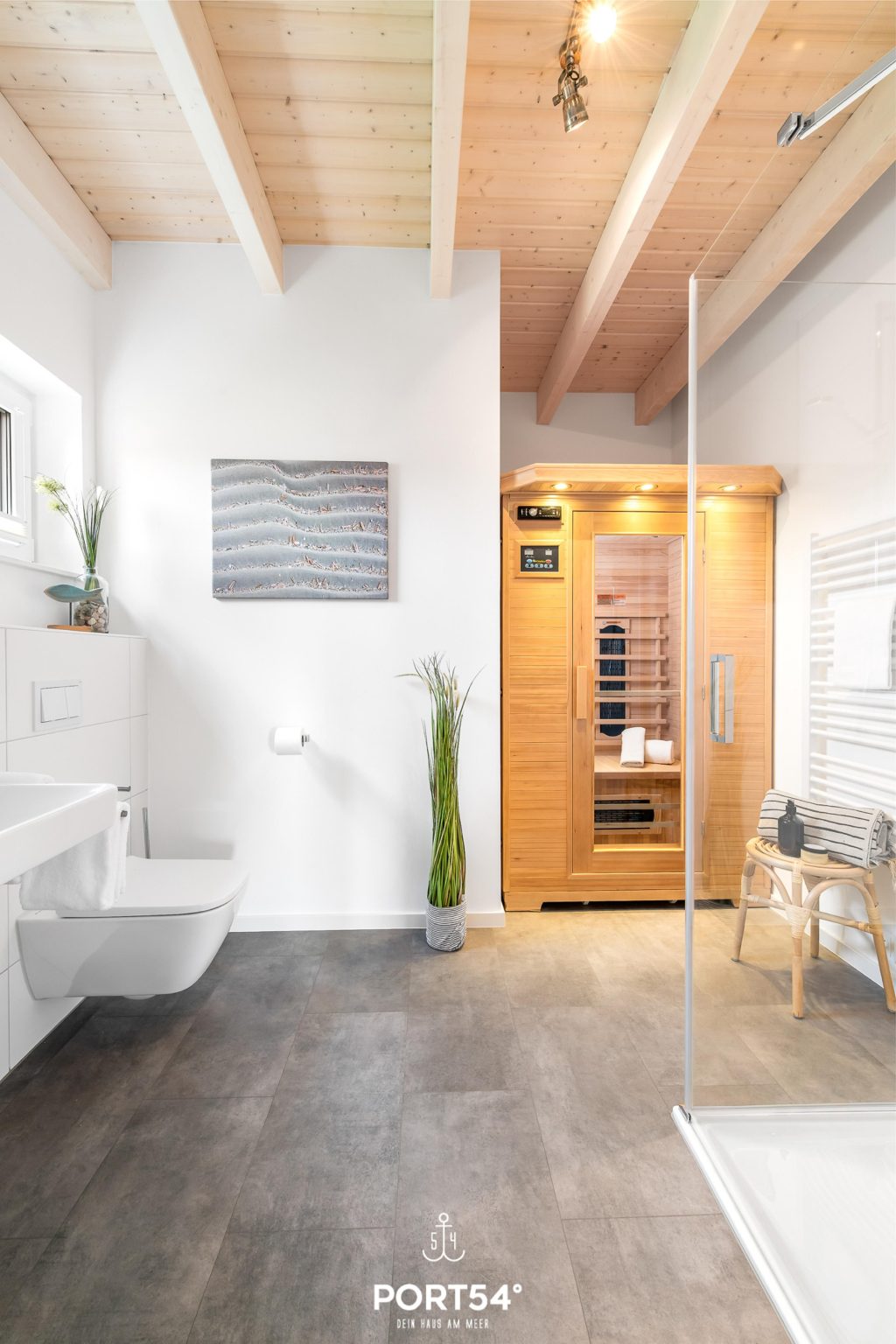 Im Obergeschoss findest Du zwei Schlafzimmer. Eines ist mit einem komfortablen Doppelbett (180x200 cm) ausgestattet, das andere bietet zwei Einzelbetten (je 90x200 cm). Beide Zimmer verfügen über Flachbild-TVs, sodass jeder seinen Abend nach Belieben gestalten kann. Zwei moderne Badezimmer runden das Angebot ab: Eines mit Dusche und Infrarot-Sauna für entspannte Wellness-Momente, das andere mit Badewanne für gemütliche Bäder.