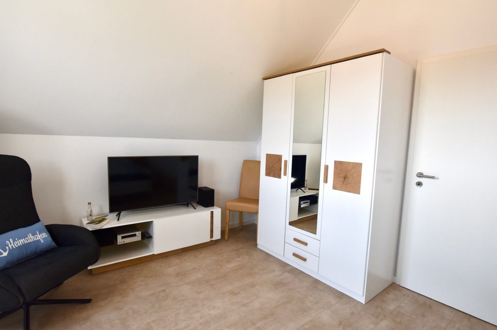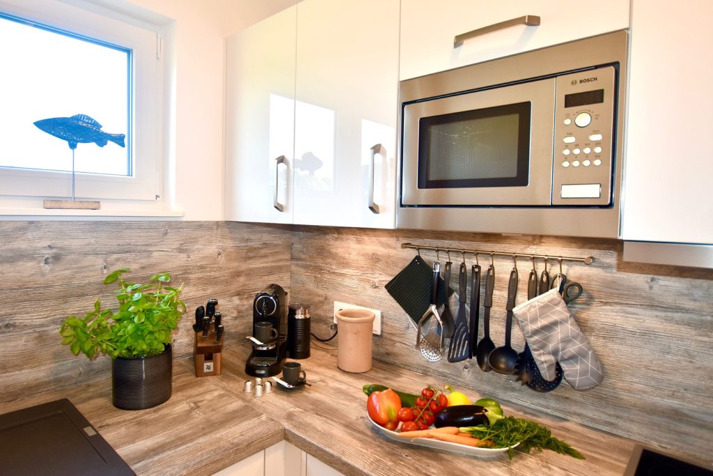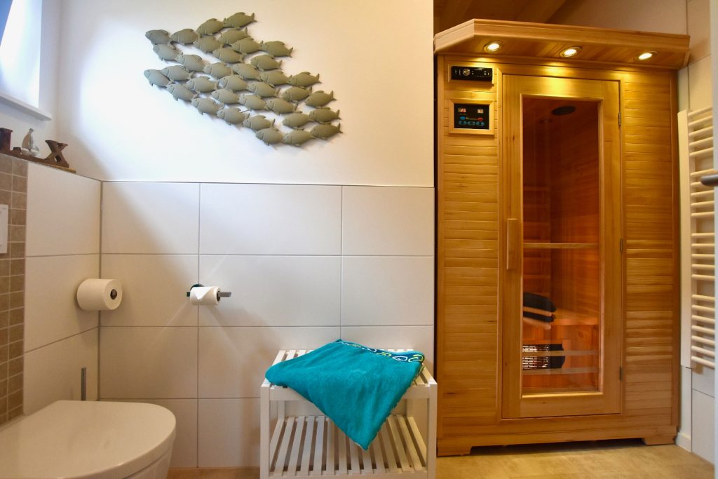 Die separate, voll ausgestattete Küche bietet Dir alles, was Du für die Selbstversorgung benötigst – ideal für entspannte Kochabende. Ebenfalls im Erdgeschoss befindet sich ein modernes Badezimmer mit Dusche sowie einer Infrarot-Sauna, in der Du nach langen Spaziergängen am Meer wunderbar entspannen kannst.