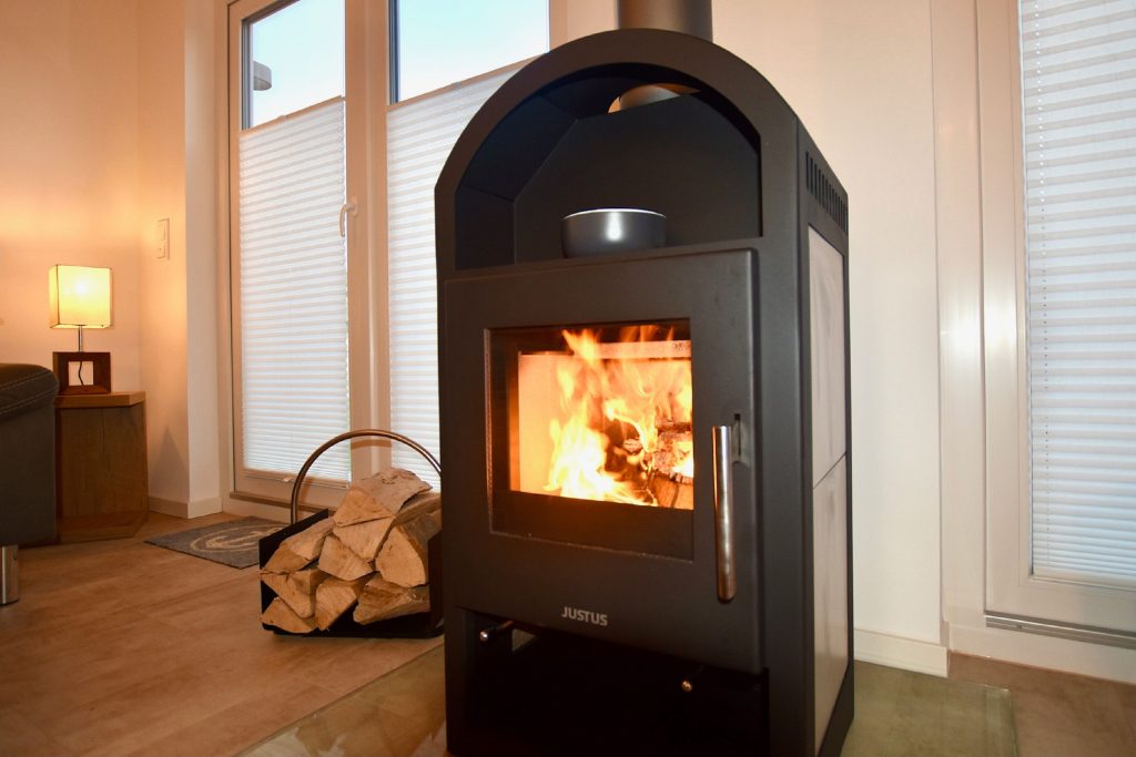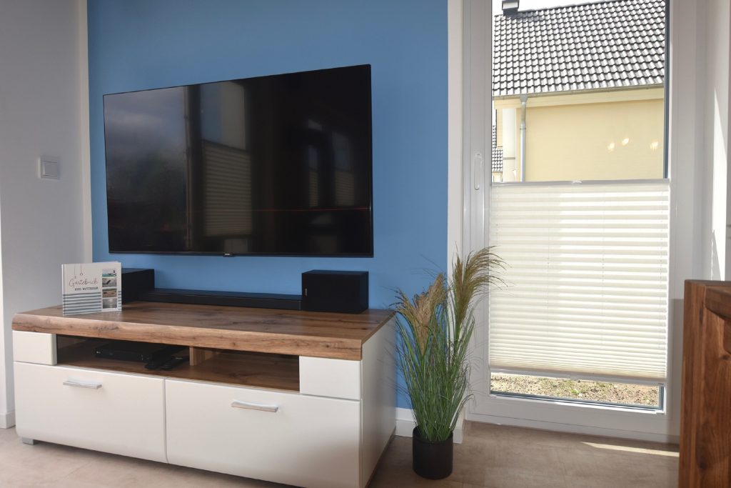 Im Erdgeschoss erwartet Dich ein lichtdurchfluteter Wohn- und Essbereich mit großer Fensterfront und direktem Zugang zur sonnigen Terrasse. Hier kannst Du auf dem gemütlichen Sofa entspannen, ein gutes Buch lesen oder einen Film auf dem großen Flachbild-TV mit Apple AirPlay 2 genießen. Der Kamin sorgt besonders an kühleren Tagen für eine behagliche Atmosphäre. Der angrenzende Essbereich lädt zu gemeinsamen Mahlzeiten und geselligen Abenden ein.