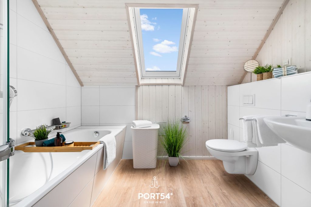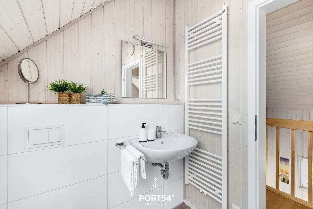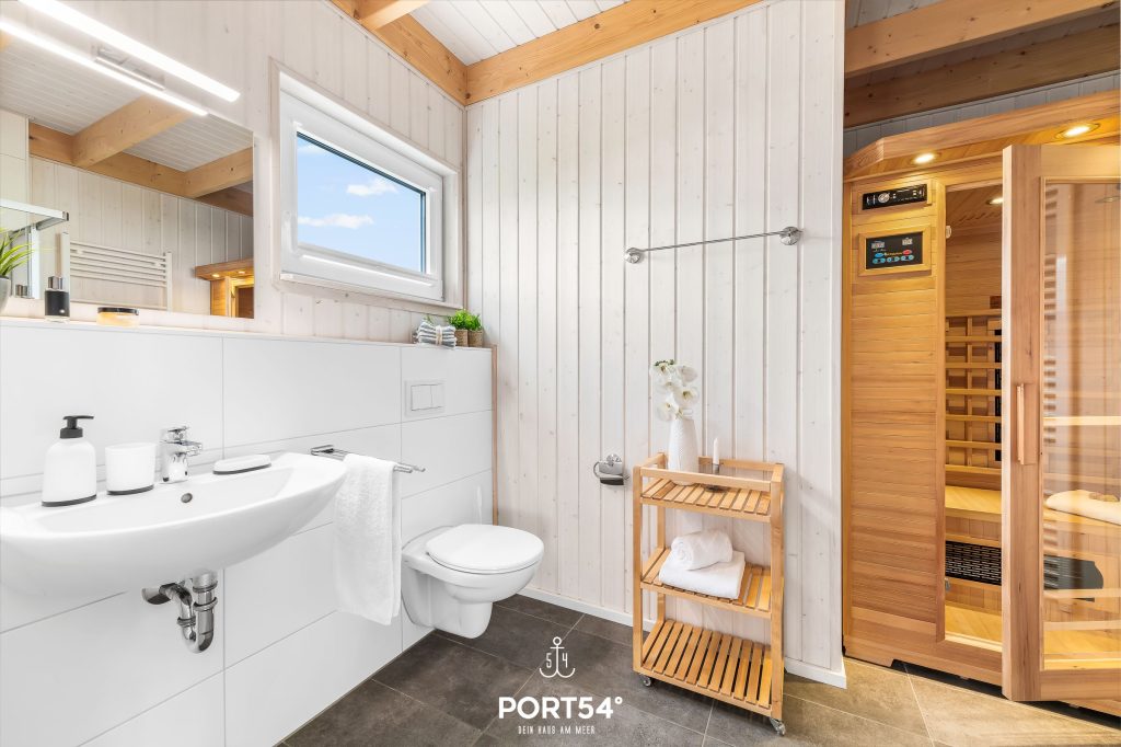 Ein Badezimmer mit Fenster und Sichtschutz befindet sich im Erdgeschoss und ist mit einer ebenerdigen Dusche, einer Handtuchheizung, einem Föhn sowie dem Highlight, einer Infrarot-Sauna, ausgestattet. Hier kannst Du Dich an kalten Tagen aufwärmen und entspannen.