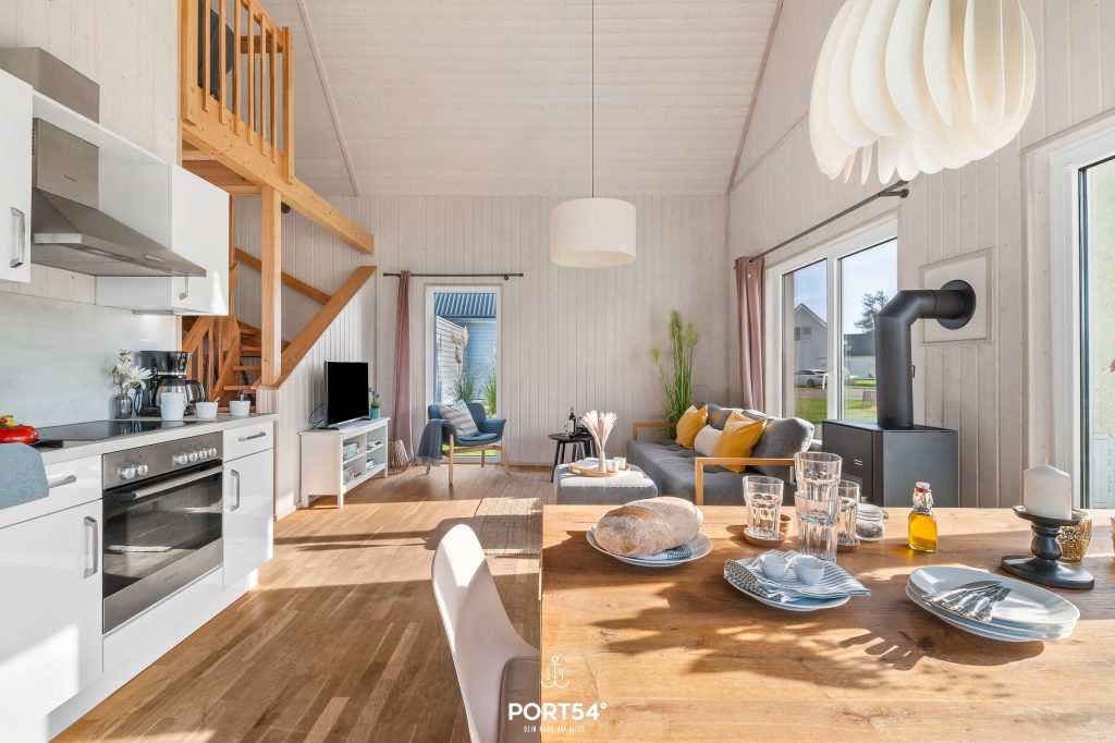 Das freistehende, 98 m² große Haus verfügt über einen offenen Wohn- und Essbereich mit Kaminofen und Küchenzeile, drei Schlafzimmer und zwei Bäder. Die loftartige Bauweise mit bodentiefen Fenstern sorgt für ein großzügiges Wohngefühl.