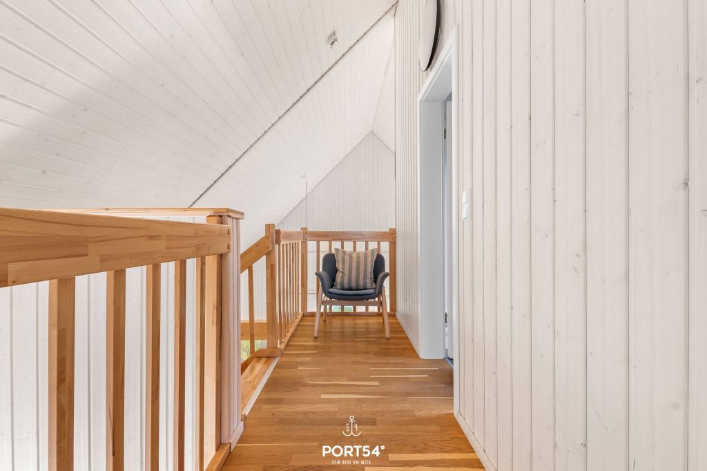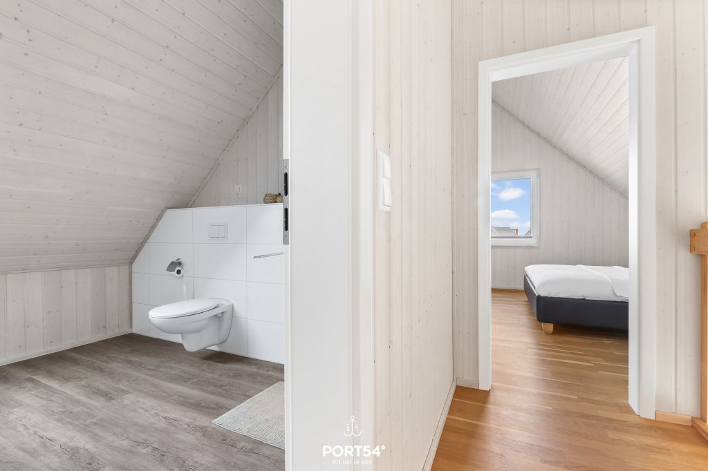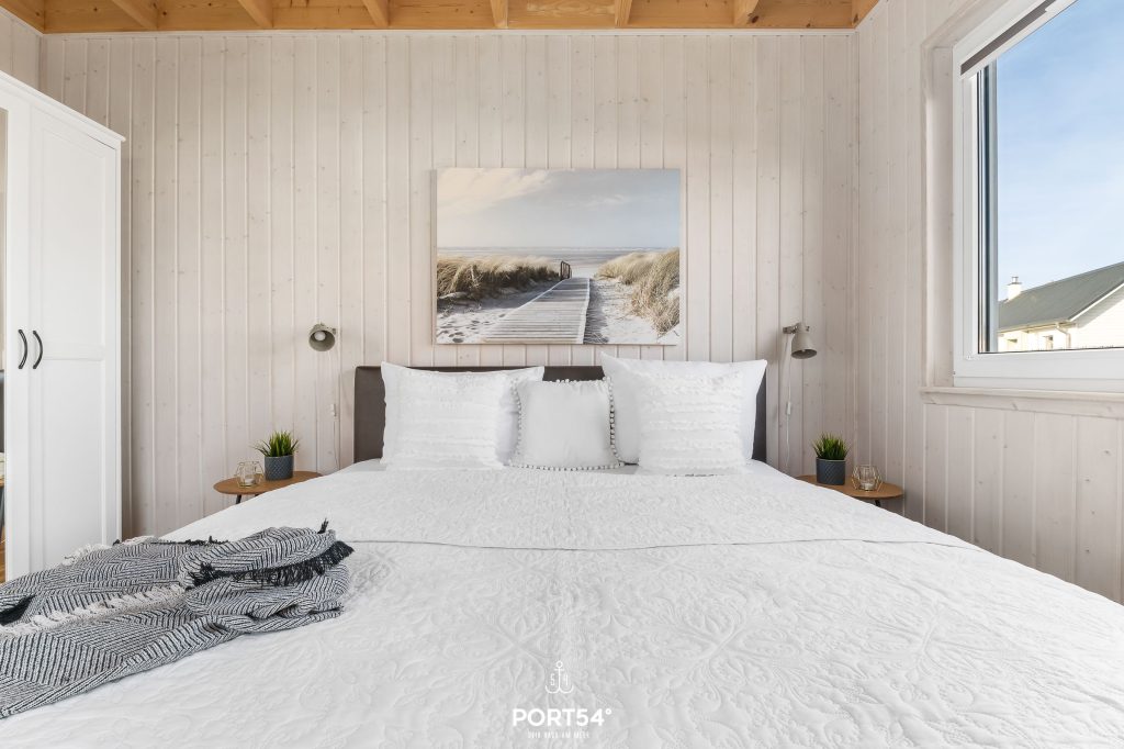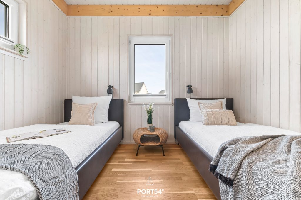 Im Erdgeschoss findest Du zwei Schlafzimmer. Eines verfügt über ein Boxspring-Doppelbett (180x200 cm), das zweite über zwei Boxspringbetten (90x200 cm). In einem Schlafzimmer steht Dir ein Kleiderschrank zur Verfügung, im anderen eine Kommode. Die Fenster bieten Verdunkelungsmöglichkeiten, sodass einem erholsamen Schlaf nichts mehr im Wege steht.