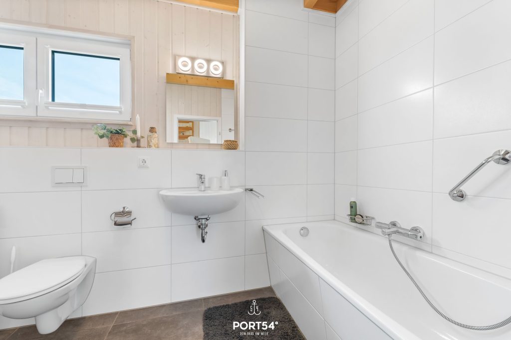 Das Bad im Erdgeschoss bietet eine Badewanne, einen Handtuchheizkörper und das Highlight des Hauses, eine Infrarot-Sauna. Es ist der ideale Ort, um zu entspannen.