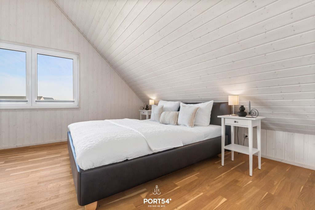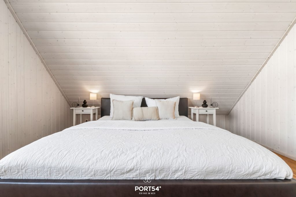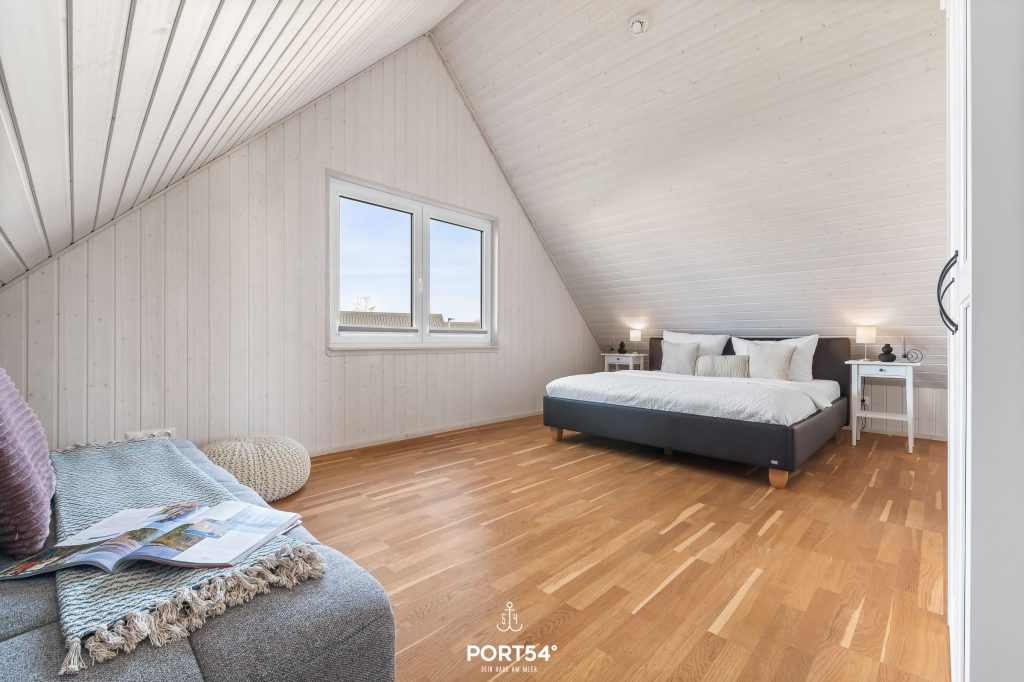 Ein weiteres Schlafzimmer mit großem Boxspring-Doppelbett (180x200 cm) und einem Schlafsofa als Ausweichmöglichkeit ist ebenfalls im Obergeschoss untergebracht.