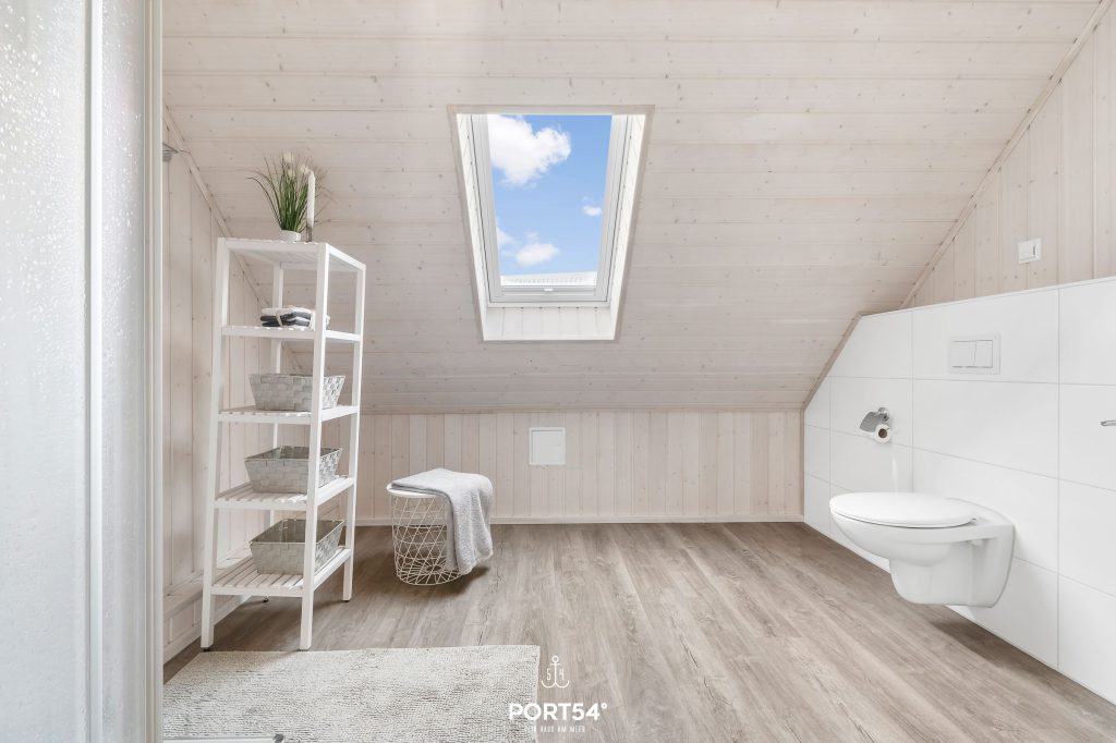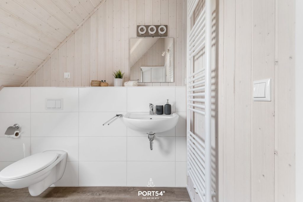 Im Obergeschoss befindet sich ein weiteres Bad mit Dusche, WC und ebenfalls einem Handtuchheizkörper.