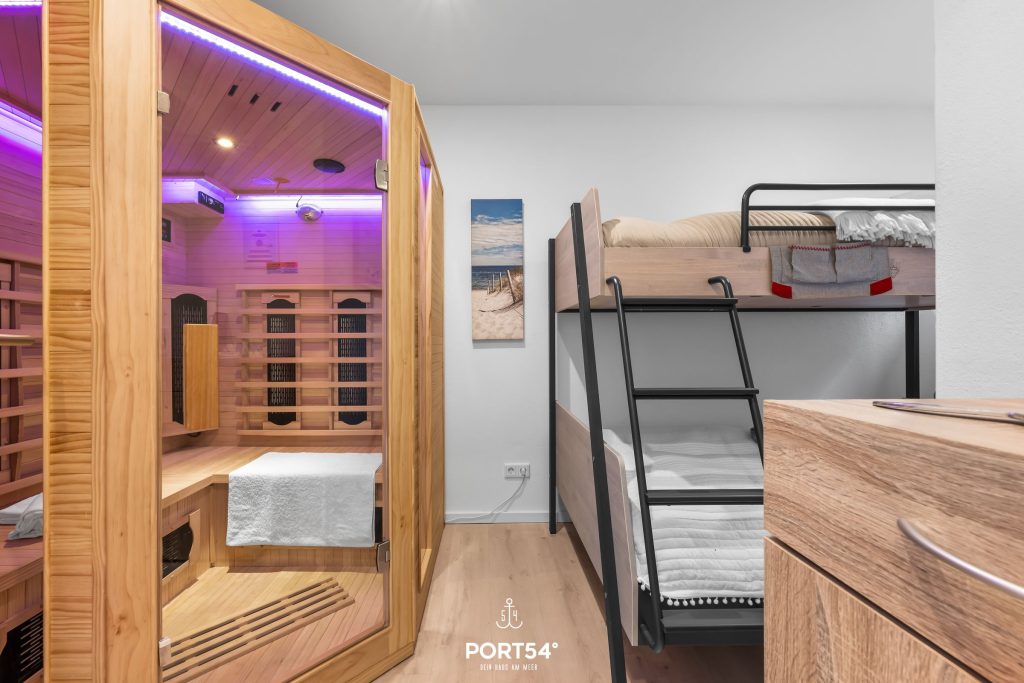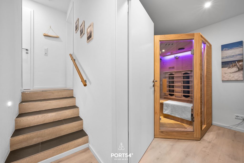 Über eine Treppe gelangst Du zu den beiden Schlafzimmern, der Infrarot-Sauna und dem modernen Badezimmer im Souterrain, das über eine ebenerdige Dusche mit Regenduschkopf verfügt.